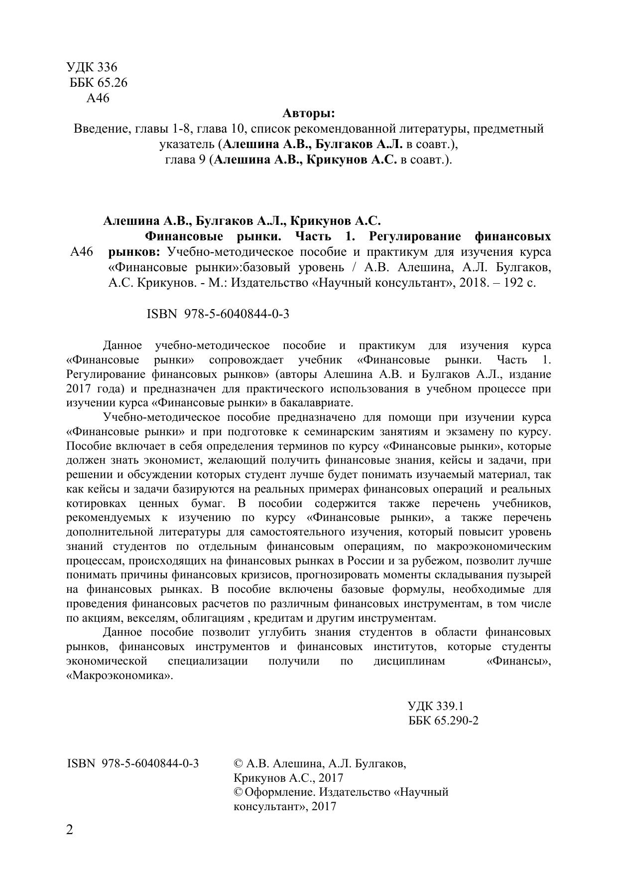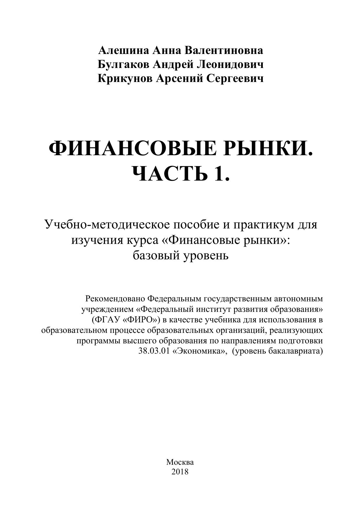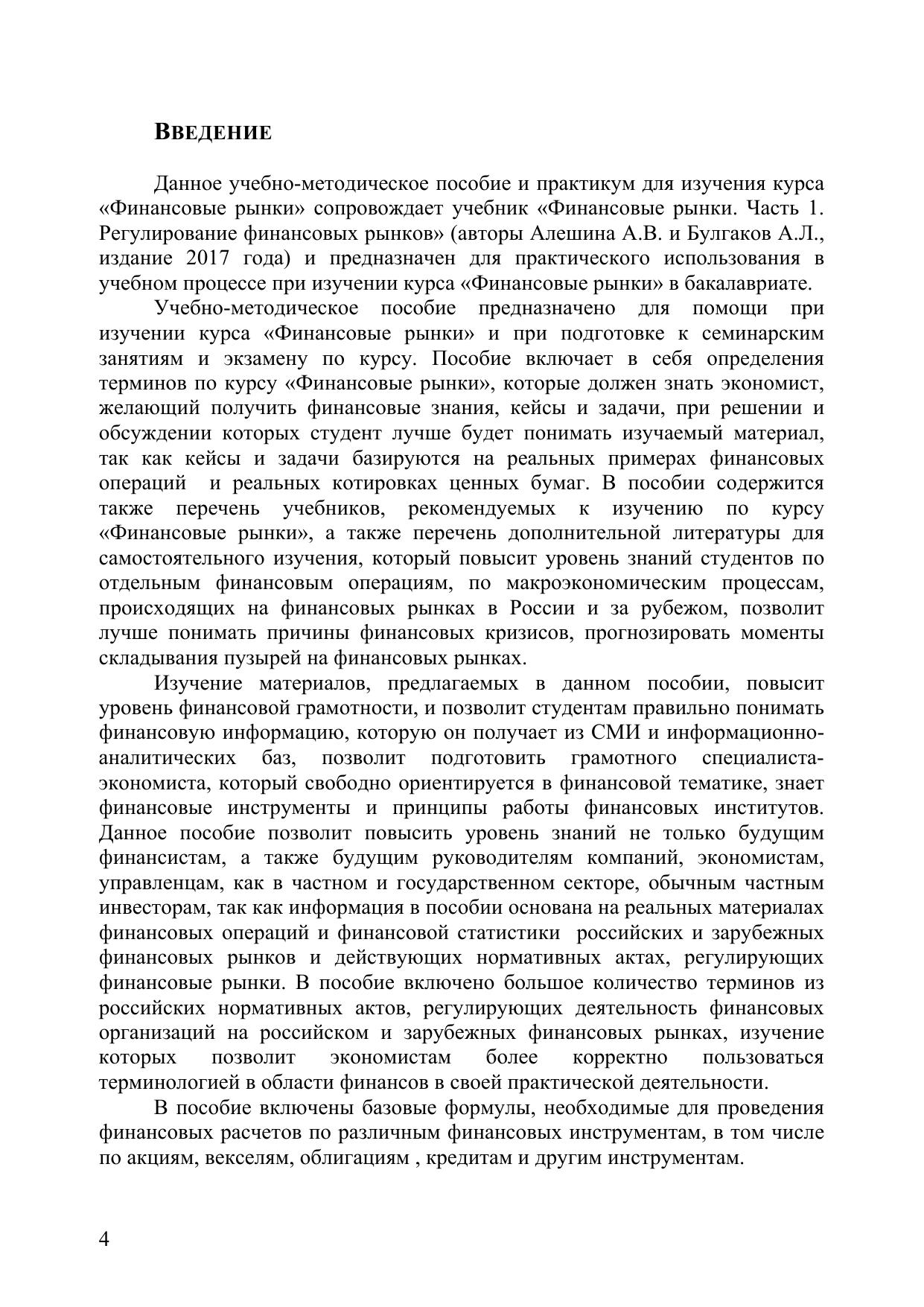 Данное учебно-методическое пособие и практикум для изучения курса «Финансовые рынки» сопровождает учебник «Финансовые рынки. Часть 1. Регулирование финансовых рынков» (авторы Алешина А. В. и Булгаков А. Л., издание 2017 года) и предназначен для практического использования в учебном процессе при изучении курса «Финансовые рынки» в бакалавриате. Учебно-методическое пособие предназначено для помощи при изучении курса «Финансовые рынки» и при подготовке к семинарским занятиям и экзамену по курсу. Пособие включает в себя определения терминов по курсу «Финансовые рынки», которые должен знать экономист, желающий получить финансовые знания, кейсы и задачи, при решении и обсуждении которых студент лучше будет понимать изучаемый материал, так как кейсы и задачи базируются на реальных примерах финансовых операций и реальных котировках ценных бумаг. В пособии содержится также перечень учебников, рекомендуемых к изучению по курсу «Финансовые рынки», а также перечень дополнительной литературы для самостоятельного изучения, который повысит уровень знаний студентов по отдельным финансовым операциям, по макроэкономическим процессам, происходящих на финансовых рынках в России и за рубежом, позволит лучше понимать причины финансовых кризисов, прогнозировать моменты складывания пузырей на финансовых рынках. В пособие включены базовые формулы, необходимые для проведения финансовых расчетов по различным финансовых инструментам, в том числе по акциям, векселям, облигациям , кредитам и другим инструментам. Данное пособие позволит углубить знания студентов в области финансовых рынков, финансовых инструментов и финансовых институтов, которые студенты экономической специализации получили по дисциплинам «Финансы», «Макроэкономика»