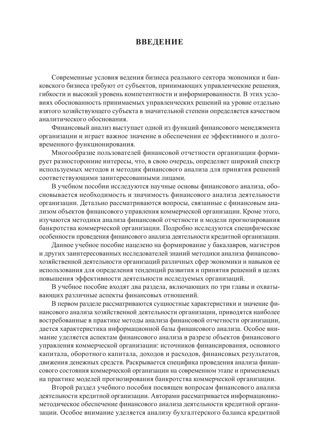 В учебном пособии рассматривается круг вопросов, раскрывающих сущность финансового анализа: особенности проведения финансового анализа в коммерческих организациях реального сектора экономики и кредитных организациях. Особое внимание уделено финансовому анализу объектов финансового управления коммерческой организации, применяющимся на практике методикам анализа финансово-хозяйственной деятельности организаций реального сектора экономики и финансового анализа деятельности кредитных организаций. Спецификой учебного пособия является материал, представленный в коллаборации денежных потоков в корпоративном и банковском секторах экономики. Все вопросы рассматриваются