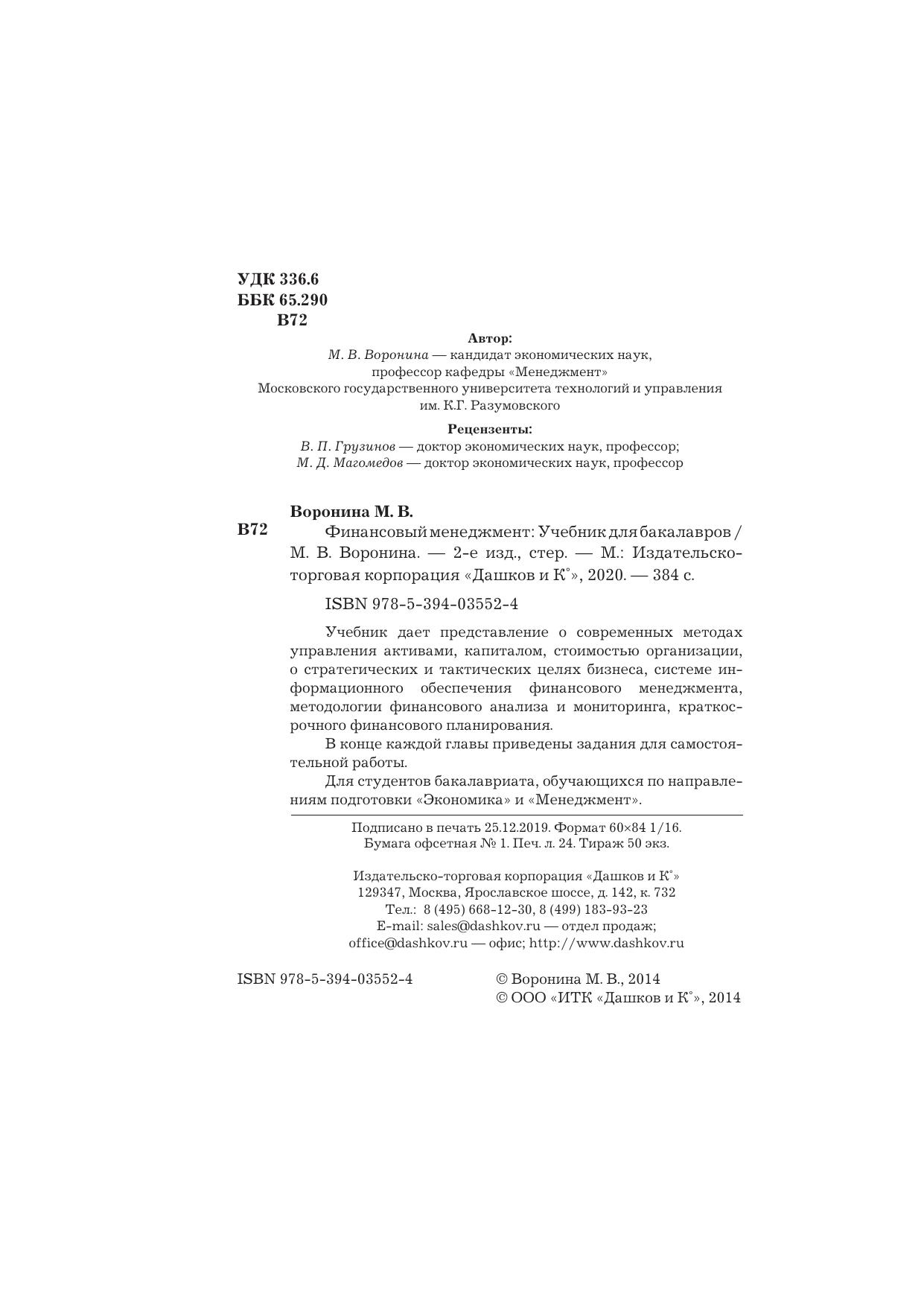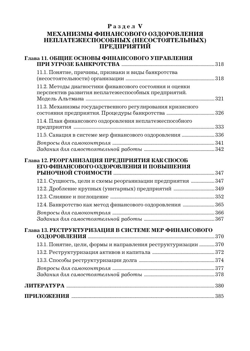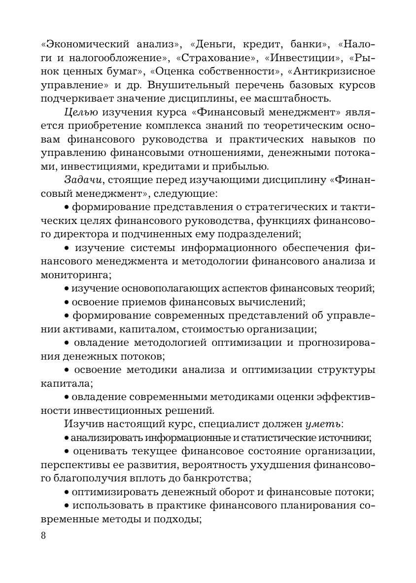 Учебник дает представление о современных методах управления активами, капиталом, стоимостью организации, о стратегических и тактических целях бизнеса, системе информационного обеспечения финансового менеджмента, методологии финансового анализа и мониторинга, краткосрочного финансового планирования, позволяет овладеть приемами оптимизации и прогнозирования денежных потоков и источников финансирования, принятия долгосрочных инвестиционных решений и диагностики банкротства, механизмами финансового оздоровления и схемами реорганизации бизнеса. В конце каждой главы приведены задания для самостоятельной работы, включающие перечень вопросов, а также задания и задачи, формирующие и развивающие профессиональные компетенции и навыки. Для студентов бакалавриата, обучающихся по направлениям подготовки «Экономика» и «Менеджмент».