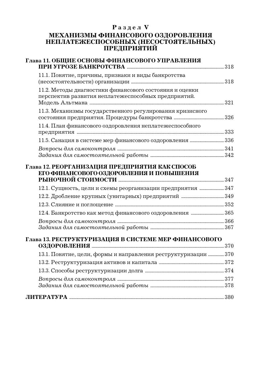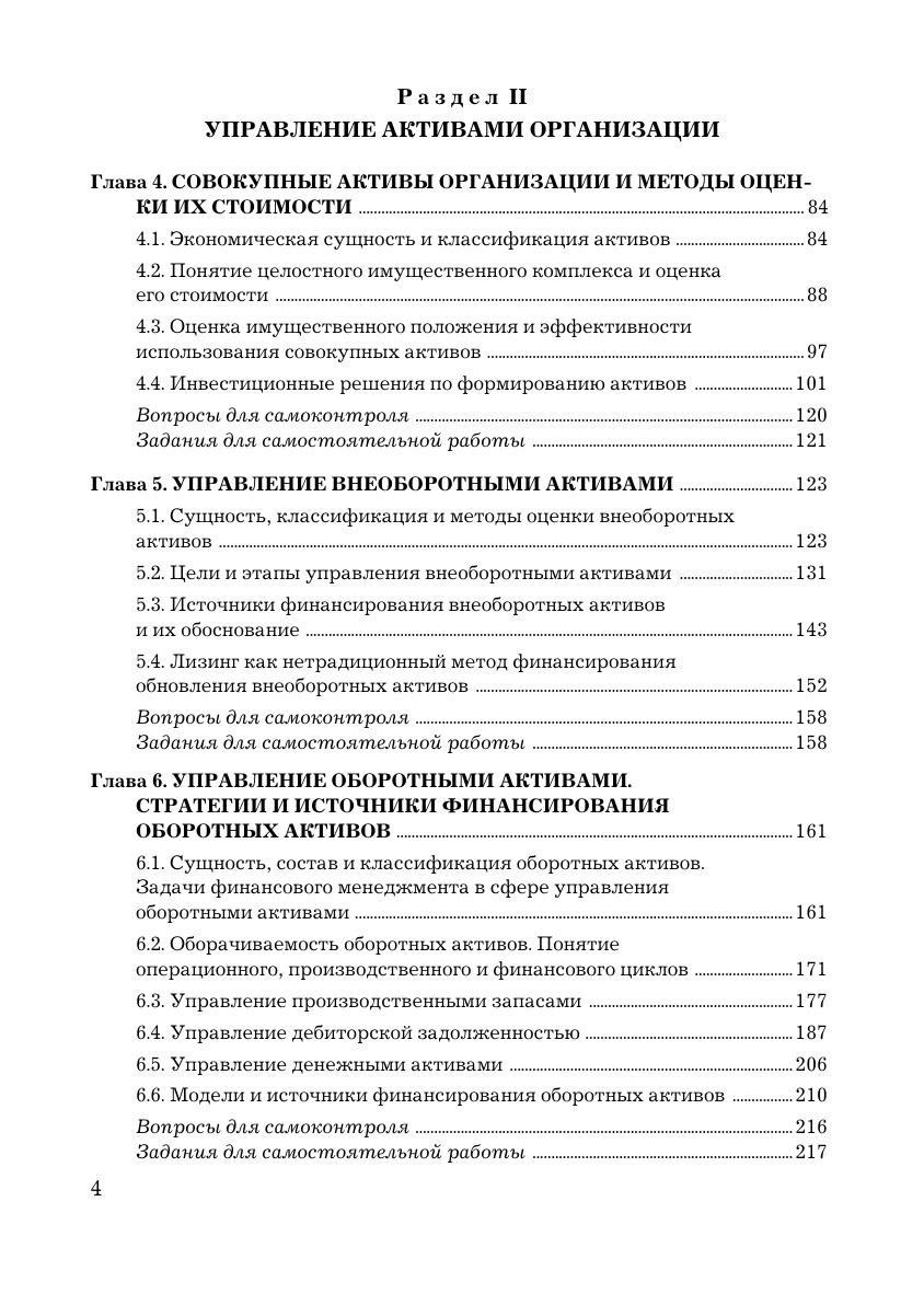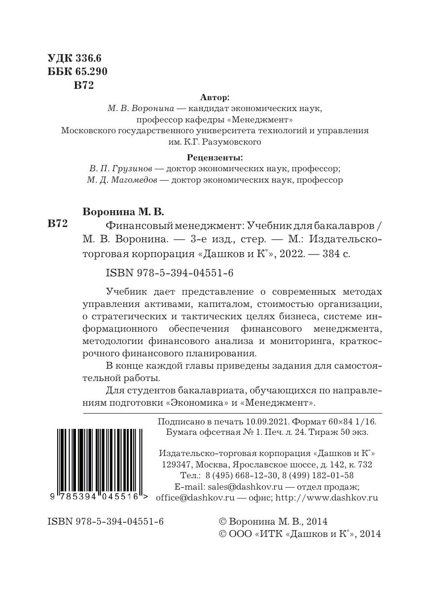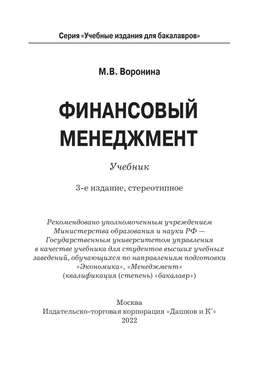 Учебник дает представление о современных методах управления активами, капиталом, стоимостью организации, о стратегических и тактических целях бизнеса, системе информационного обеспечения финансового менеджмента, методологии финансового анализа и мониторинга, краткосрочного финансового планирования, позволяет овладеть приемами оптимизации и прогнозирования денежных потоков и источников финансирования, принятия долгосрочных инвестиционных решений и диагностики банкротства, механизмами финансового оздоровления и схемами реорганизации бизнеса. В конце каждой главы приведены задания для самостоятельной работы, включающие перечень вопросов, а также задания и задачи, формирующие и развивающие профессиональные компетенции и навыки. Для студентов бакалавриата, обучающихся по направлениям подготовки «Экономика» и «Менеджмент».