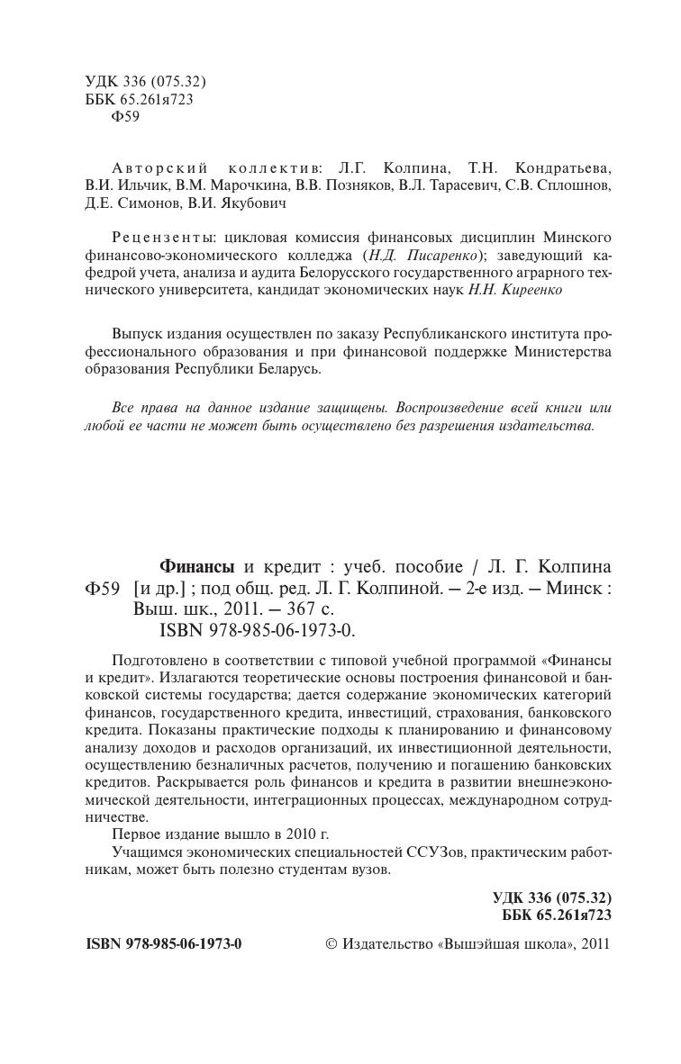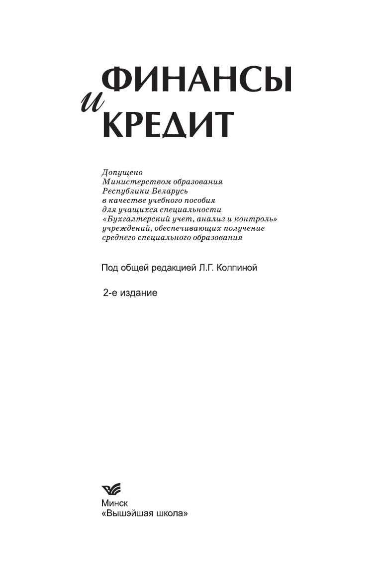 Подготовлено в соответствии с типовой учебной программой «Финансы и кредит». Излагаются теоретические основы построения финансовой и банковской системы государства дается содержание экономических категорий финансов, государственного кредита, инвестиций, страхования, банковского кредита. Показаны практические подходы к планированию и финансовому анализу доходов и расходов организаций, их инвестиционной деятельности, осуществлению безналичных расчетов, получению и погашению банковских кредитов. Раскрывается роль финансов и кредита в развитии внешнеэкономической деятельности, интеграционных процессах, международном сотрудничестве. Первое издание вышло в 2010 г. Учащимся экономических специальностей ССУЗов, практическим работникам, может быть полезно студентам вузов.