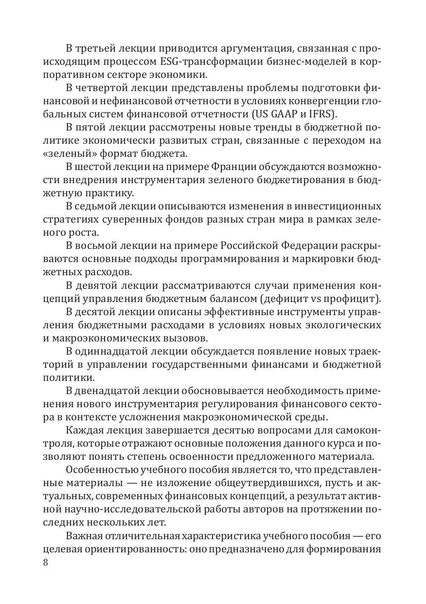 Представлены основные алгоритмы и инструменты ESG-трансформации в бизнесе и бюджетном процессе. Описаны основные принципы раскрытия финансовой информации, связанной с устойчивым развитием в концепции ESG. Изложены методические и практические вопросы внедрения принципов устойчивого развития и зеленого инструментария в процессе управления государственными и корпоративными финансами.