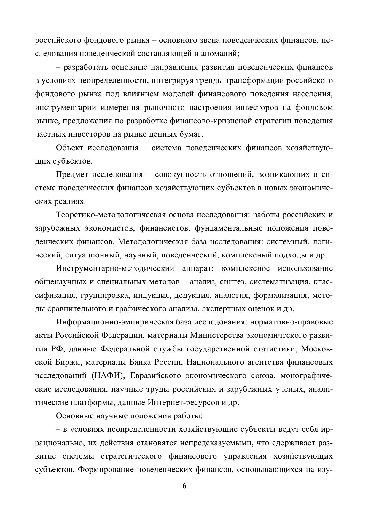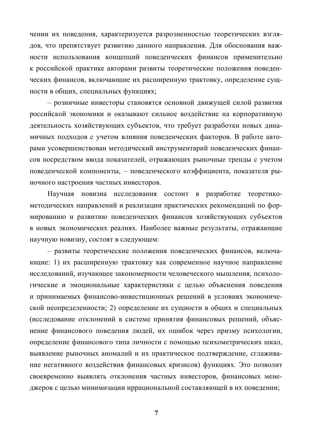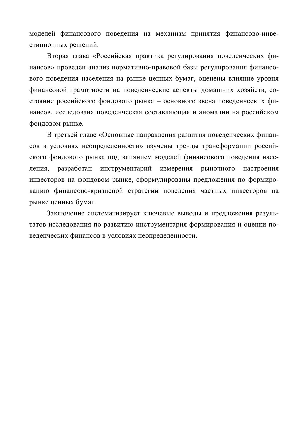 Предложены теоретические и методические положения к формированию и развитию поведенческих финансов в условиях неопределенности. С теоретико-методических позиций: проведено эволюционное исследование сущности поведенческих финансов и взаимосвязи с другими науками, охарактеризованы их звенья, функции, влияние моделей финансового поведения на механизм принятия финансово-инвестиционных решений; по практическому направлению – осуществлен анализ нормативно-правовой базы регулирования финансового поведения населения на рынке ценных бумаг, оценены влияние уровня финансовой грамотности на поведенческие аспекты домашних хозяйств, состояние российского фондового рынка – основного звена поведенческих финансов, исследованы поведенческая составляющая и аномалии; по усовершенствованному методическому направлению – разработаны основные направления развития поведенческих финансов в условиях неопределенности, интегрируя тренды трансформации российского фондового рынка под влиянием моделей финансового поведения населения, инструментарий измерения рыночного настроения инвесторов на фондовом рынке, предложения по разработке финансово-кризисной стратегии поведения частных инвесторов на рынке ценных бумаг. Это позволит разработать и реализовать инструментарий к формированию и развитию поведенческих финансов хозяйствующих субъектов в новых экономических реалиях.