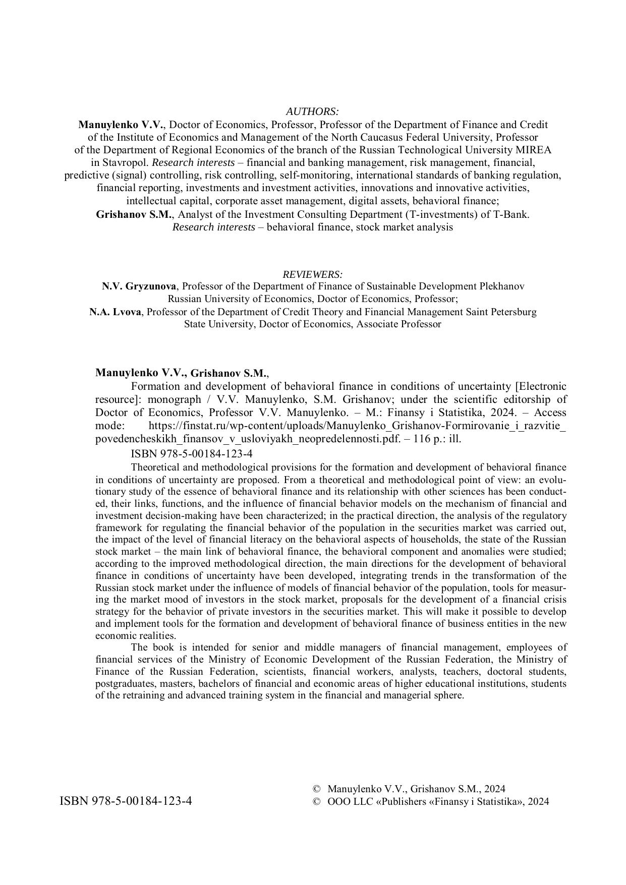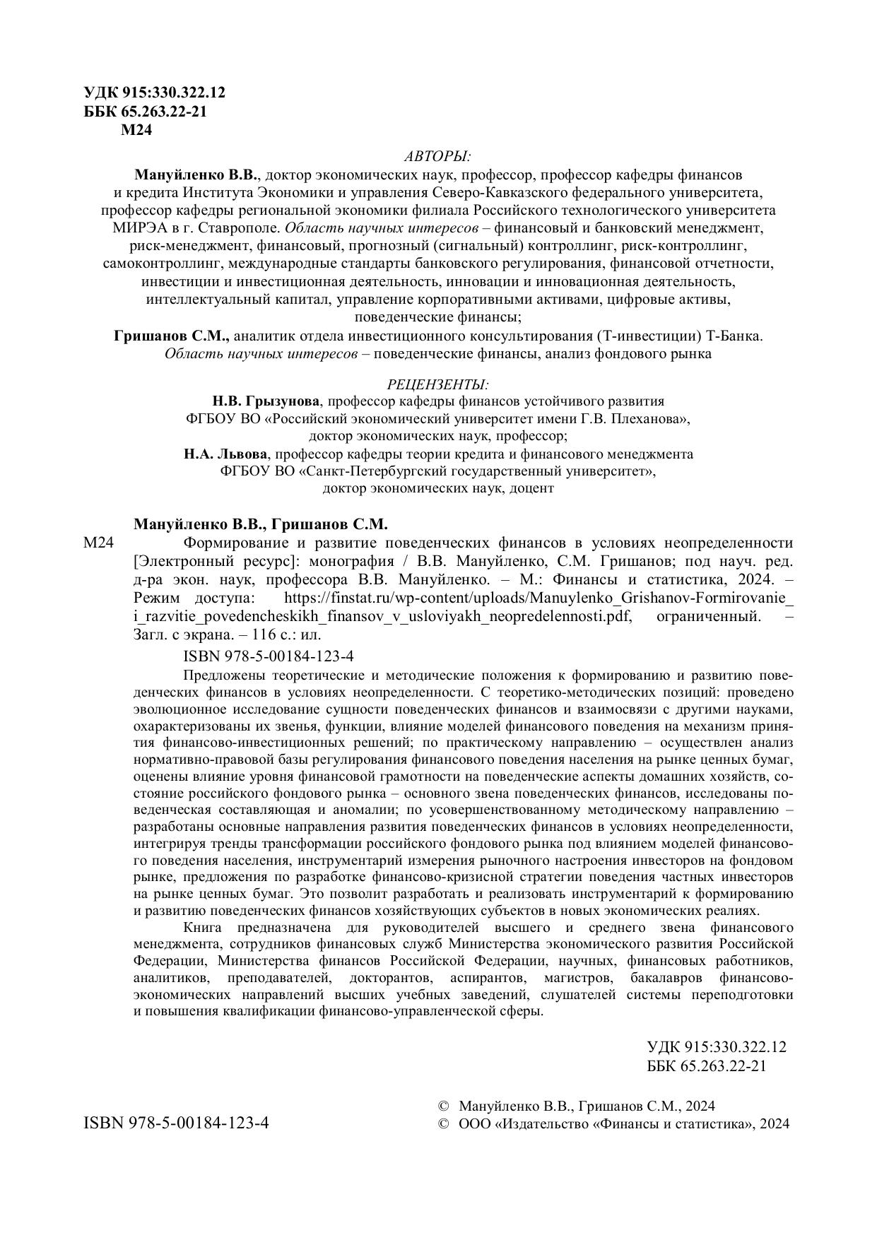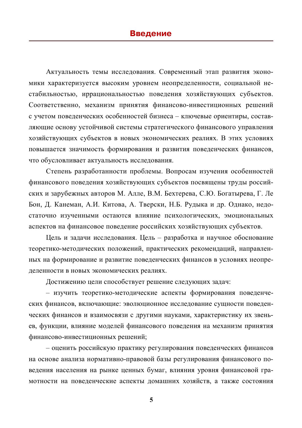 Предложены теоретические и методические положения к формированию и развитию поведенческих финансов в условиях неопределенности. С теоретико-методических позиций: проведено эволюционное исследование сущности поведенческих финансов и взаимосвязи с другими науками, охарактеризованы их звенья, функции, влияние моделей финансового поведения на механизм принятия финансово-инвестиционных решений; по практическому направлению – осуществлен анализ нормативно-правовой базы регулирования финансового поведения населения на рынке ценных бумаг, оценены влияние уровня финансовой грамотности на поведенческие аспекты домашних хозяйств, состояние российского фондового рынка – основного звена поведенческих финансов, исследованы поведенческая составляющая и аномалии; по усовершенствованному методическому направлению – разработаны основные направления развития поведенческих финансов в условиях неопределенности, интегрируя тренды трансформации российского фондового рынка под влиянием моделей финансового поведения населения, инструментарий измерения рыночного настроения инвесторов на фондовом рынке, предложения по разработке финансово-кризисной стратегии поведения частных инвесторов на рынке ценных бумаг. Это позволит разработать и реализовать инструментарий к формированию и развитию поведенческих финансов хозяйствующих субъектов в новых экономических реалиях.