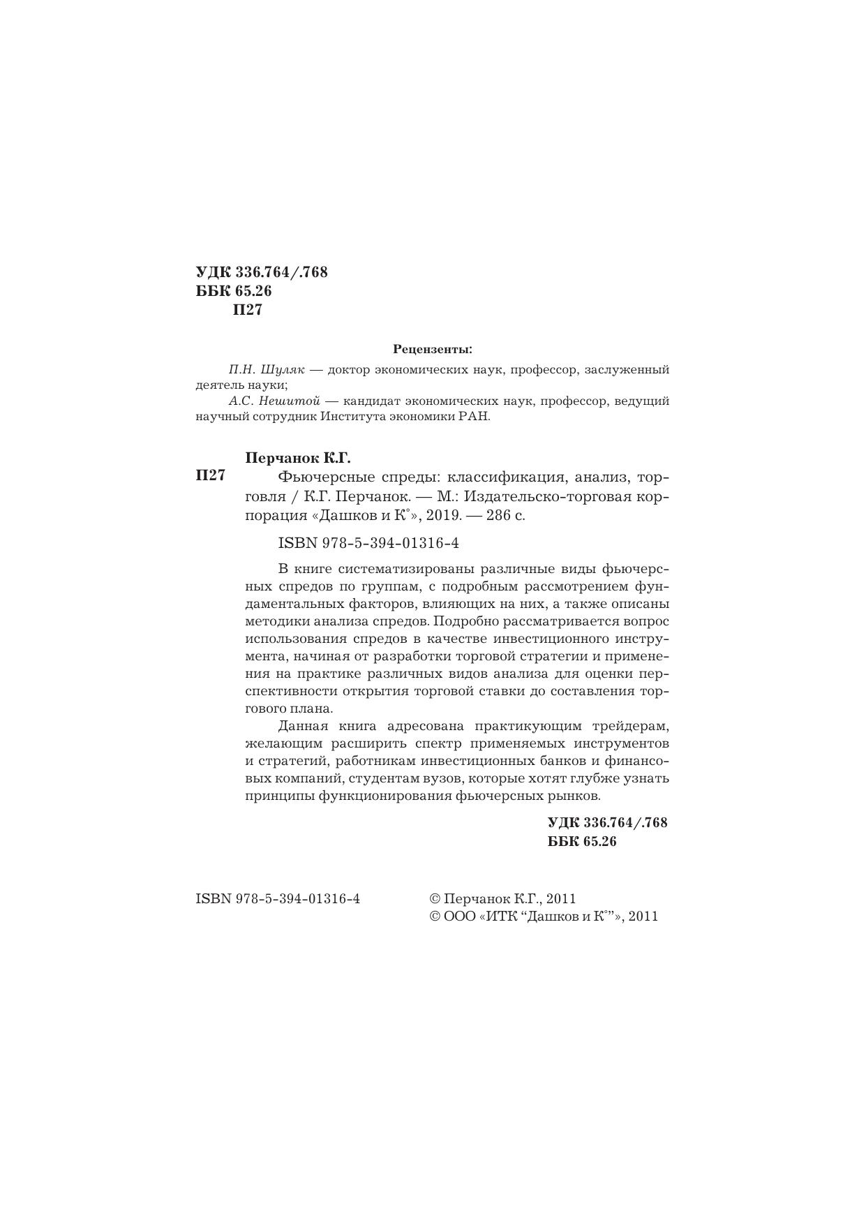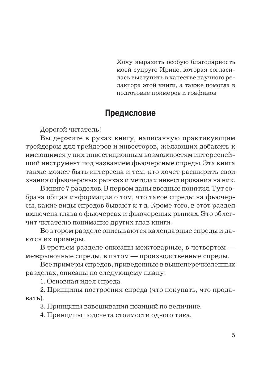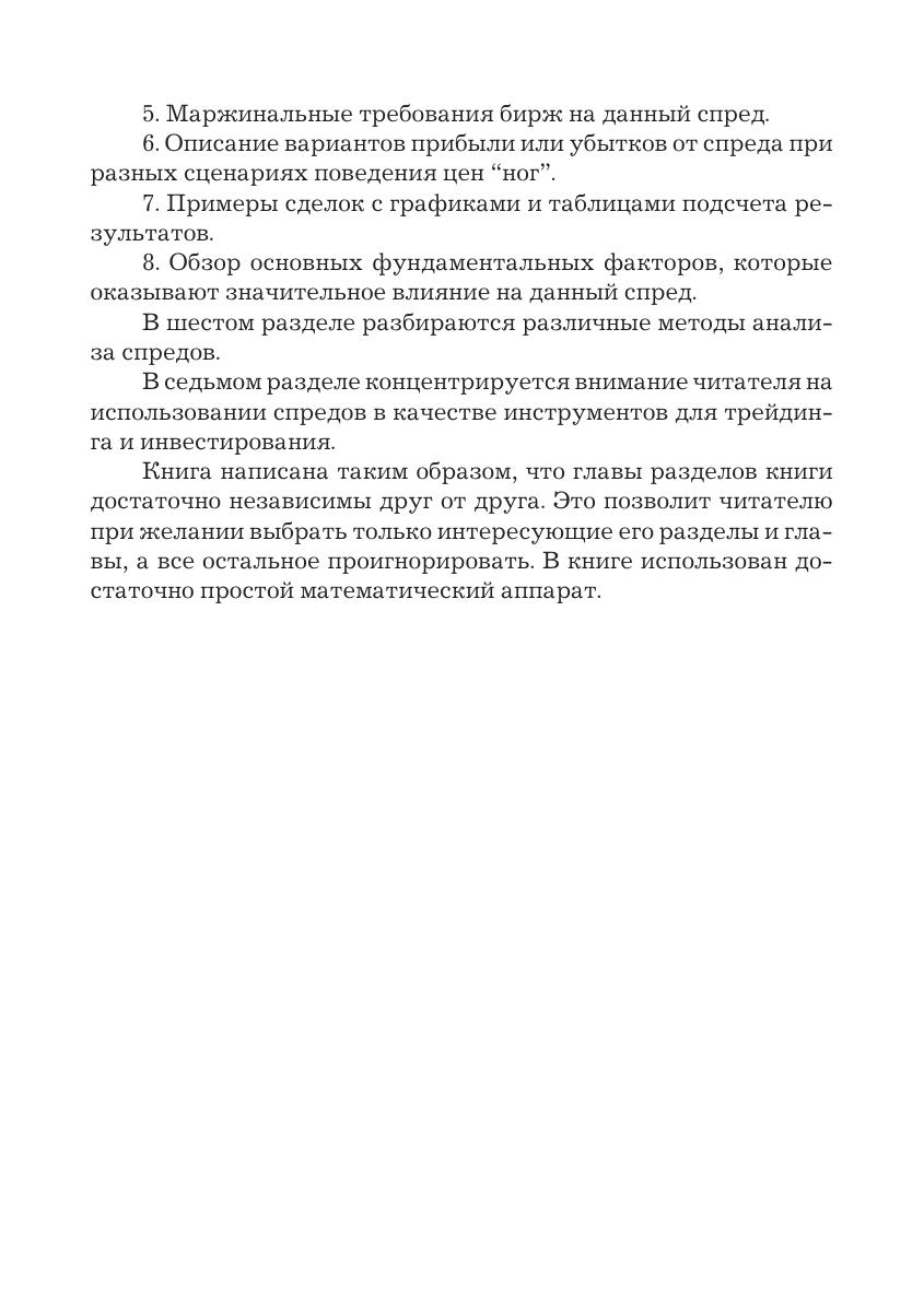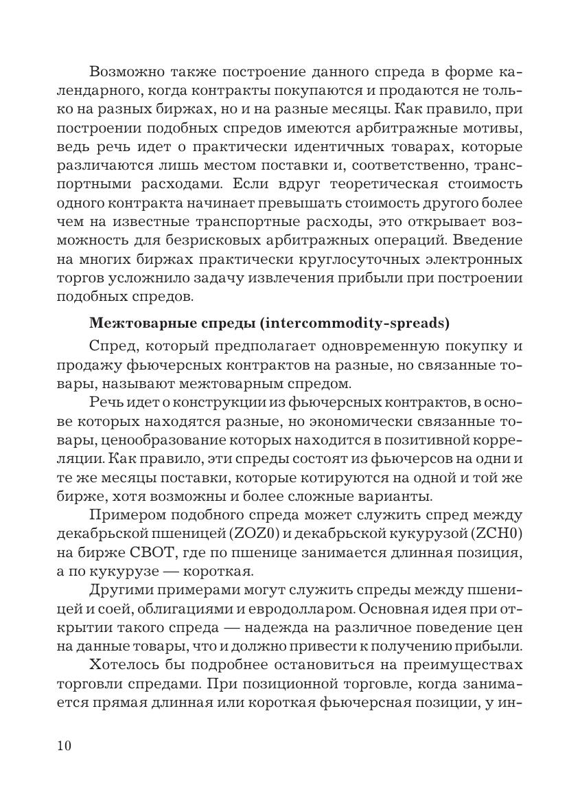 В книге систематизированы различные виды фьючерсных спредов по группам, с подробным рассмотрением фундаментальных факторов, влияющих на них, а также описаны методики анализа спредов. Подробно рассматривается вопрос использования спредов в качестве инвестиционного инструмента, начиная от разработки торговой стратегии и применения на практике различных видов анализа для оценки перспективности открытия торговой ставки до составления торгового плана. Данная книга адресована практикующим трейдерам, желающим расширить спектр применяемых инструментов и стратегий, работникам инвестиционных банков и финансовых компаний, студентам вузов, которые хотят глубже узнать принципы функционирования фьючерсных рынков.