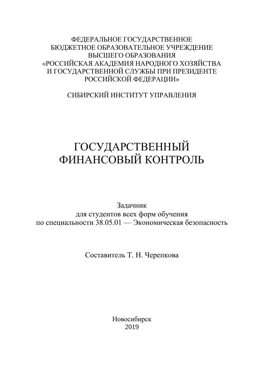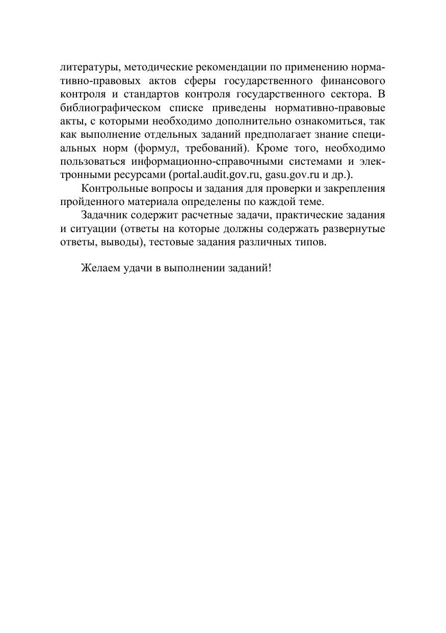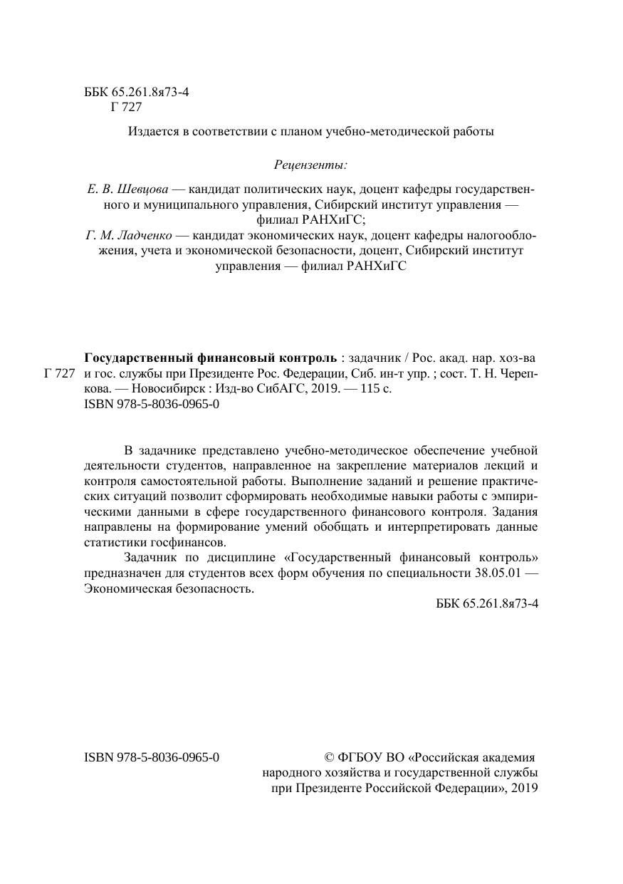 В задачнике представлено учебно-методическое обеспечение учебной деятельности студентов, направленное на закрепление материалов лекций и контроля самостоятельной работы. Выполнение заданий и решение практиче-ских ситуаций позволит сформировать необходимые навыки работы с эмпири-ческими данными в сфере государственного финансового контроля. Задания направлены на формирование умений обобщать и интерпретировать данные статистики госфинансов. Задачник по дисциплине «Государственный финансовый контроль» предназначен для студентов всех форм обучения по специальности 38.05.01 — Экономическая безопасность.