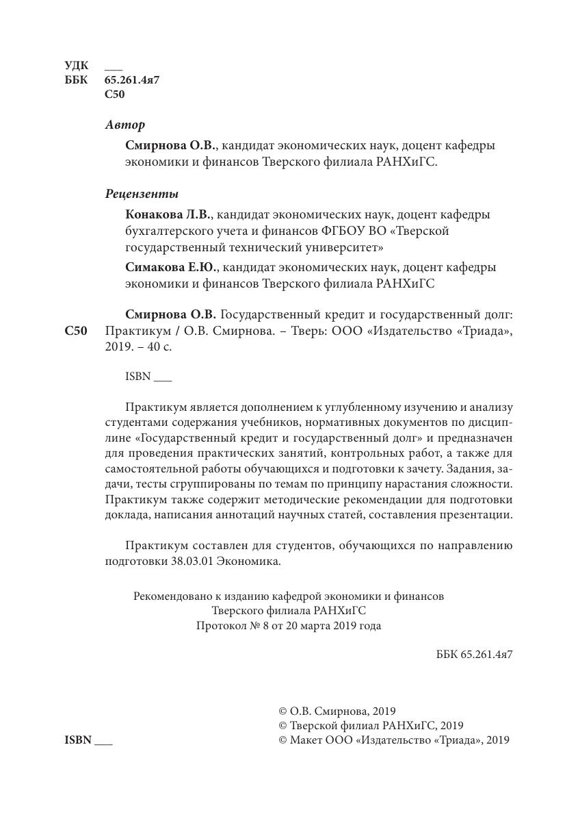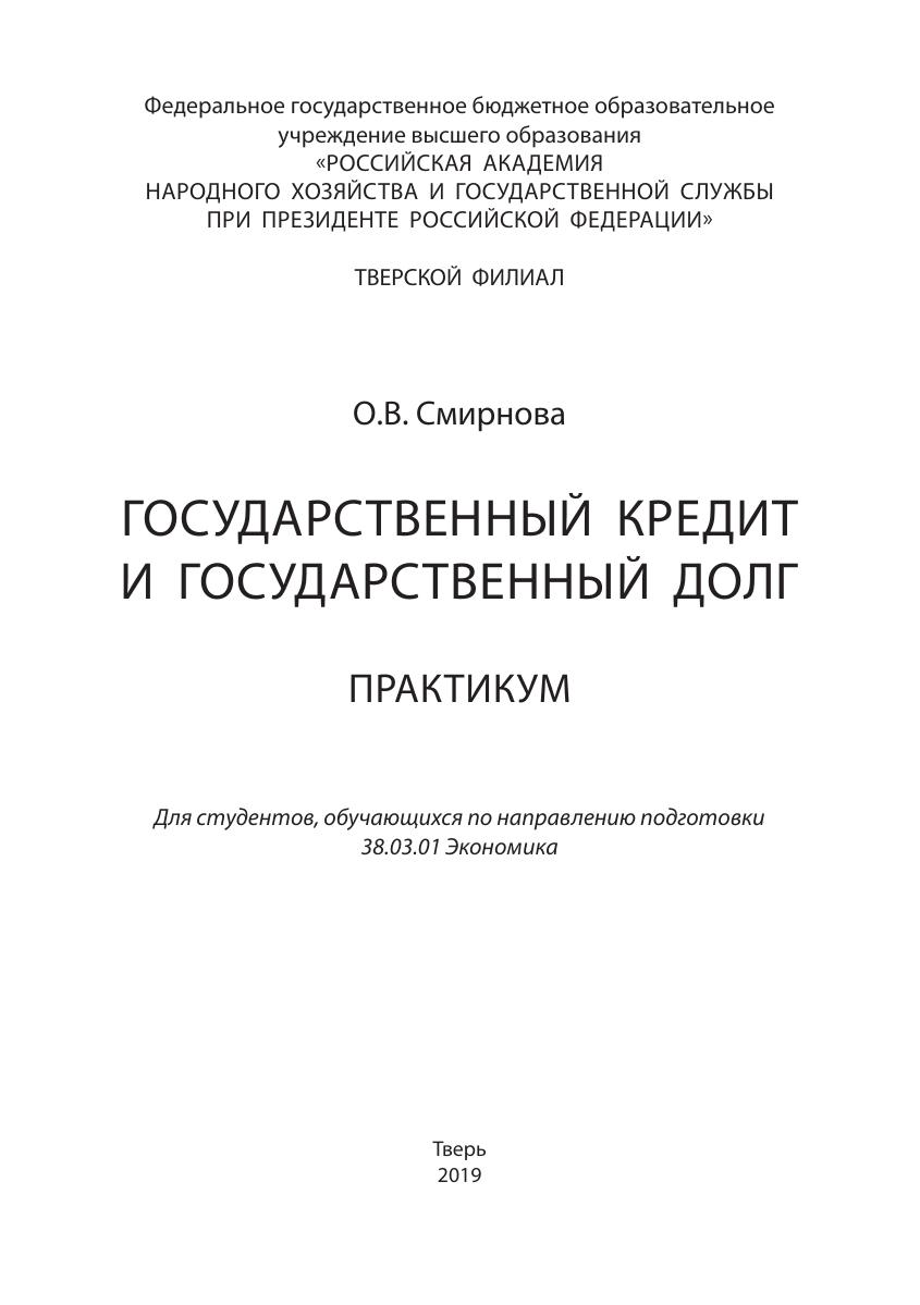Практикум является дополнением к углубленному изучению и анализу студентами содержания учебников, нормативных документов по дисциплине «Государственный кредит и государственный долг» и предназначен для проведения практических занятий, контрольных работ, а также для самостоятельной работы обучающихся и подготовки к зачету. Задания, задачи, тесты сгруппированы по темам по принципу нарастания сложности. Практикум также содержит методические рекомендации для подготовки доклада, написания аннотаций научных статей, составления презентации. Практикум составлен для студентов, обучающихся по направлению подготовки 38.03.01 Экономика.