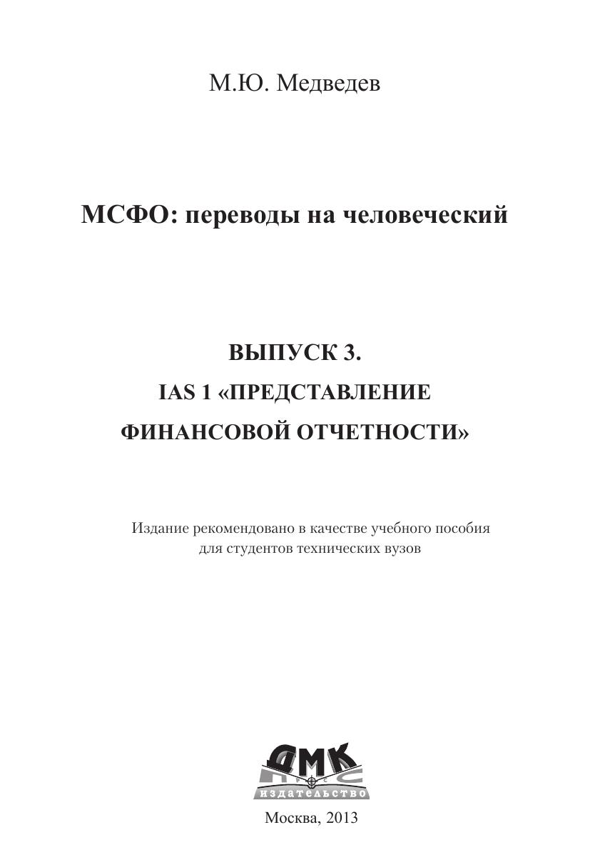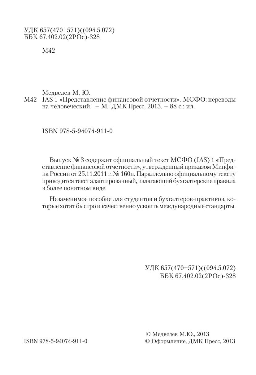 Выпуск № 3 содержит официальный текст МСФО (IAS) 1 «Представление финансовой отчетности», утвержденный приказом Минфина России от 25.11.2011 г. № 160н. Параллельно официальному тексту приводится текст адаптированный, излагающий бухгалтерские правила в более понятном виде. Незаменимое пособие для студентов и бухгалтеров-практиков, которые хотят быстро и качественно усвоить международные стандарты.