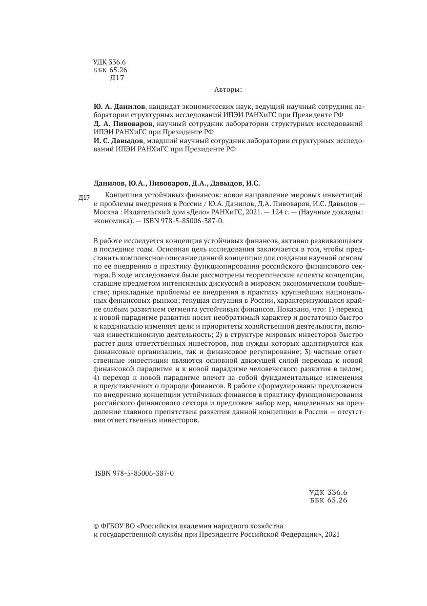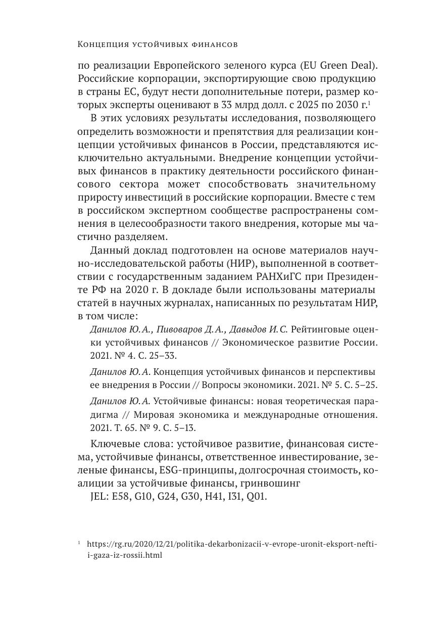 В работе исследуется концепция устойчивых финансов, активно развивающаяся в последние годы. Основная цель исследования заключается в том, чтобы представить комплексное описание данной концепции для создания научной основы по ее внедрению в практику функционирования российского финансового сектора. В ходе исследования были рассмотрены теоретические аспекты концепции, ставшие предметом интенсивных дискуссий в мировом экономическом сообществе; прикладные проблемы ее внедрения в практику крупнейших национальных финансовых рынков; текущая ситуация в России, характеризующаяся крайне слабым развитием сегмента устойчивых финансов. Показано, что: 1) переход к новой парадигме развития носит необратимый характер и достаточно быстро и кардинально изменяет цели и приоритеты хозяйственной деятельности, включая инвестиционную деятельность; 2) в структуре мировых инвесторов быстро растет доля ответственных инвесторов, под нужды которых адаптируются как финансовые организации, так и финансовое регулирование; 3) частные ответственные инвестиции являются основной движущей силой перехода к новой финансовой парадигме и к новой парадигме человеческого развития в целом; 4) переход к новой парадигме влечет за собой фундаментальные изменения в представлениях о природе финансов. В работе сформулированы предложения по внедрению концепции устойчивых финансов в практику функционирования российского финансового сектора и предложен набор мер, нацеленных на преодоление главного препятствия развития данной концепции в России — отсутствия ответственных инвесторов.