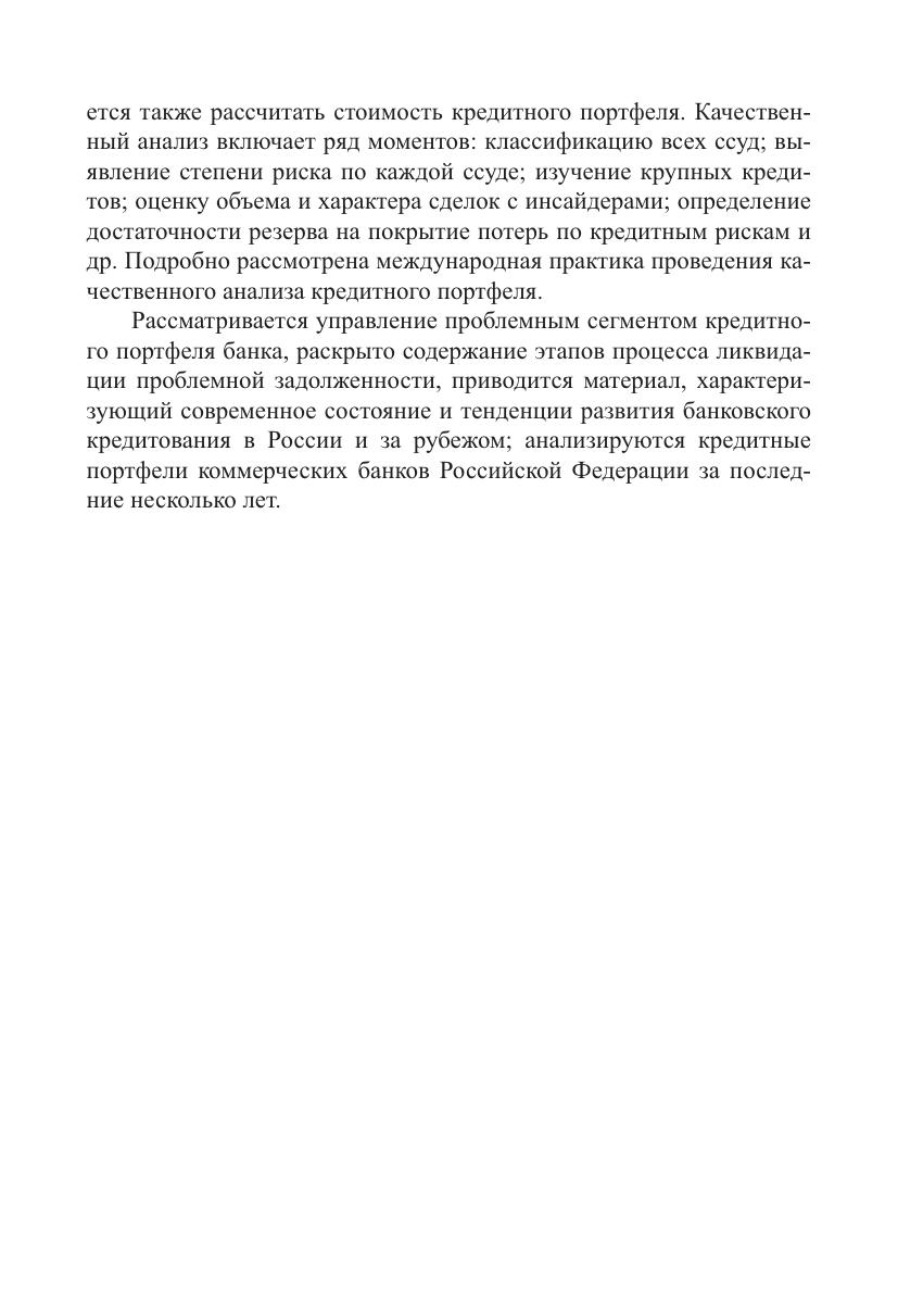 В учебном пособии рассматривается сущность кредитного портфеля на категориальном и прикладном уровнях. Выявлены функции кредитного портфеля через функции кредита. Особое внимание уделено оценке кредитного портфеля и понятию его качества, а также управлению проблемным сегментом кредитного портфеля банка. Раскрыто содержание этапов процесса ликвидации проблемной задолженности; приводится материал, характеризующий современное состояние и тенденции развития банковского кредитования в России и за рубежом; анализ и оценка кредитных портфелей коммерческих банков Российской Федерации за последние несколько лет. Для студентов высших учебных заведений, обучающихся по направлению «Экономика»(профиль «Финансы и кредит»). Пособие может быть использовано в системе переподготовки и повышения квалификации кадров, а также аспирантами, магистрами, интересующимися вопросами управления, анализа и оценки кредитного портфеля коммерческого банка.