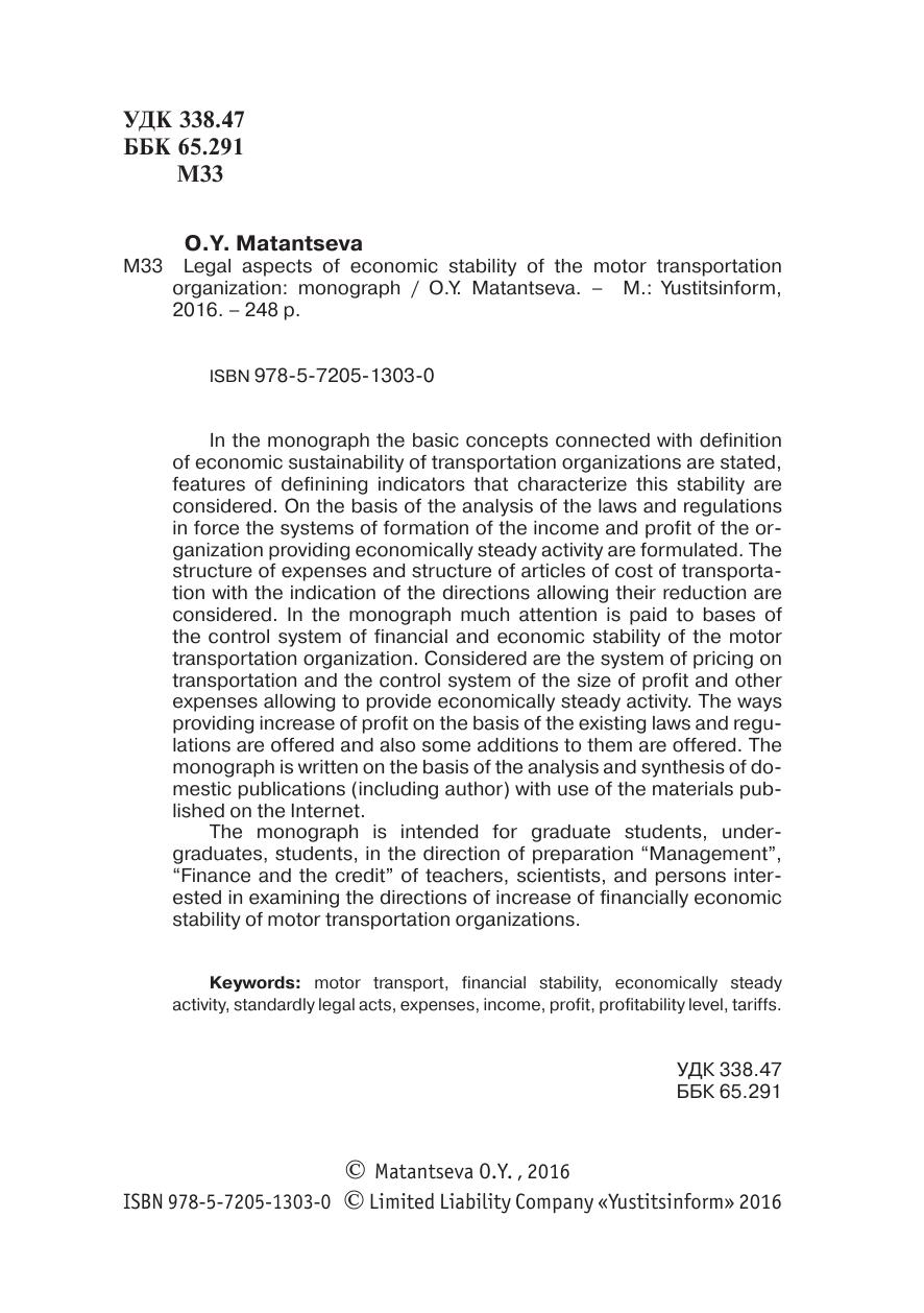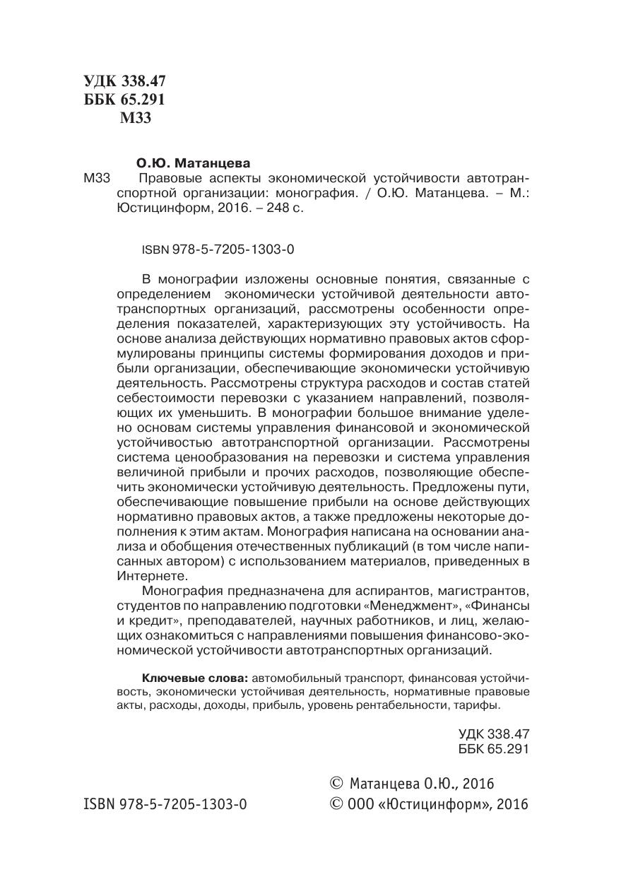 В монографии изложены основные понятия, связанные с определением экономически устойчивой деятельности автотранспортных организаций, рассмотрены особенности определения показателей, характеризующих эту устойчивость. На основе анализа действующих нормативно правовых актов сформулированы принципы системы формирования доходов и прибыли организации, обеспечивающие экономически устойчивую деятельность. Рассмотрены структура расходов и состав статей себестоимости перевозки с указанием направлений, позволяющих их уменьшить. В монографии большое внимание уделено основам системы управления финансовой и экономической устойчивостью автотранспортной организации. Рассмотрены система ценообразования на перевозки и система управления величиной прибыли и прочих расходов, позволяющие обеспечить экономически устойчивую деятельность. Предложены пути, обеспечивающие повышение прибыли на основе действующих нормативно правовых актов, а также предложены некоторые дополнения к этим актам. Монография написана на основании анализа и обобщения отечественных публикаций (в том числе написанных автором) с использованием материалов, приведенных в Интернете. Монография предназначена для аспирантов, магистрантов, студентов по направлению подготовки «Менеджмент», «Финансы и кредит», преподавателей, научных работников, и лиц, желающих ознакомиться с направлениями повышения финансово-экономической устойчивости автотранспортных организаций.