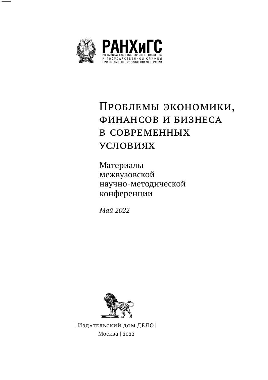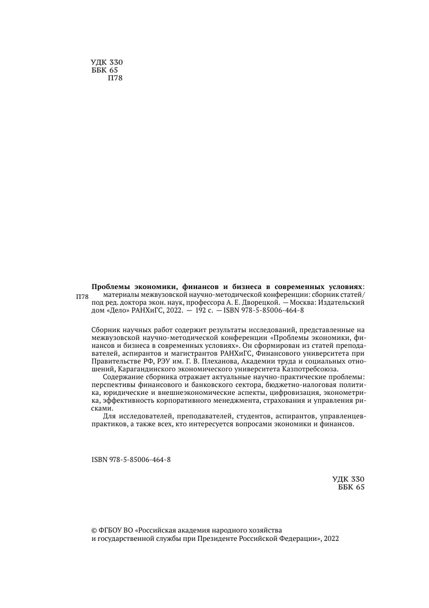 Сборник научных работ содержит результаты исследований, представленные на межвузовской научно-методической конференции «Проблемы экономики, финансов и бизнеса в современных условиях». Он сформирован из статей препода-вателей, аспирантов и магистрантов РАНХиГС, Финансового университета при Правительстве РФ, РЭУ им. Г. В. Плеханова, Академии труда и социальных отношений, Карагандинского экономического университета Казпотребсоюза. Содержание сборника отражает актуальные научно-практические проблемы: перспективы финансового и банковского сектора, бюджетно-налоговая политика, юридические и внешнеэкономические аспекты, цифровизация, эконометрика, эффективность корпоративного менеджмента, страхования и управления рисками. Для исследователей, преподавателей, студентов, аспирантов, управленцев-практиков, а также всех, кто интересуется вопросами экономики и финансов.