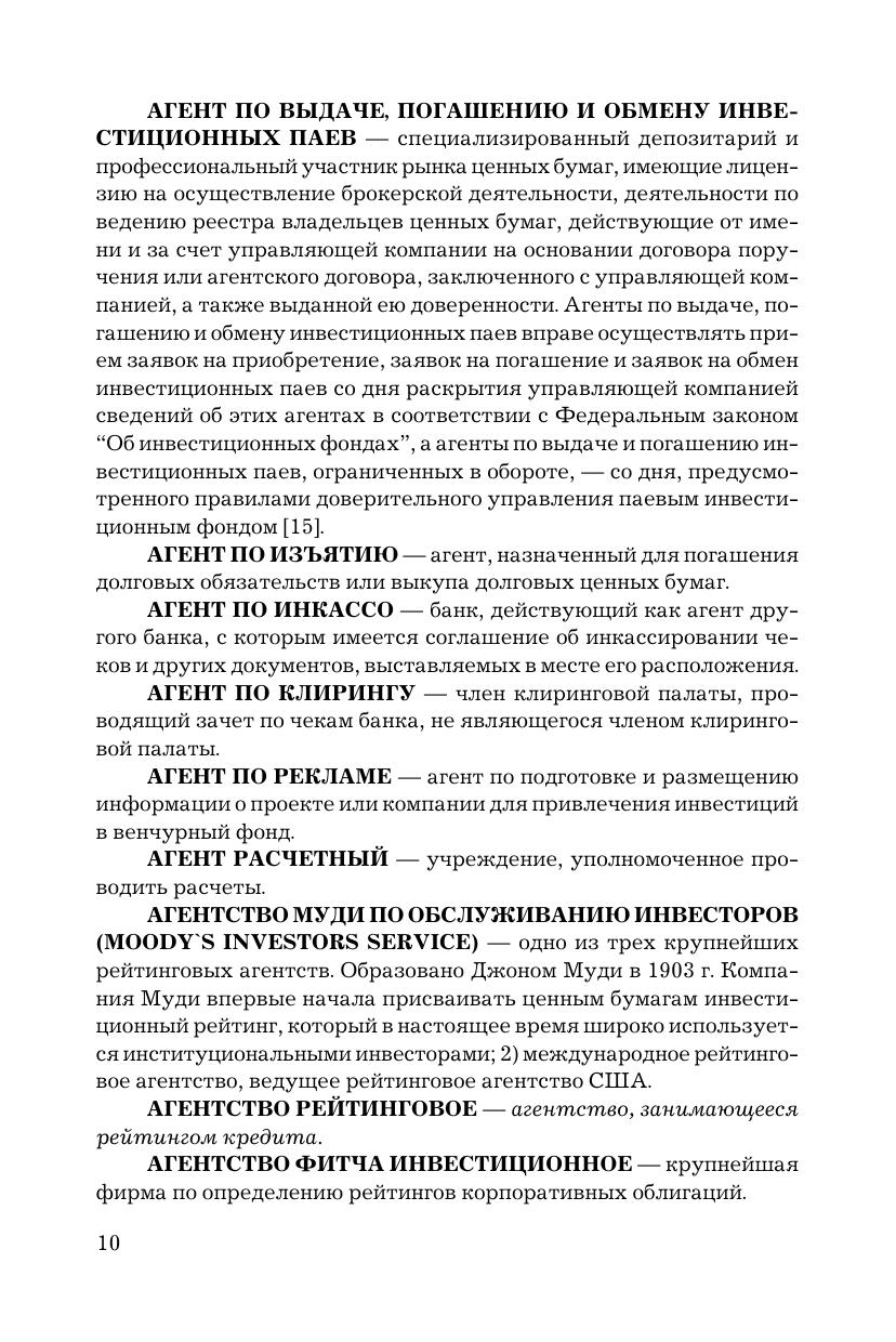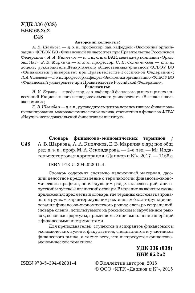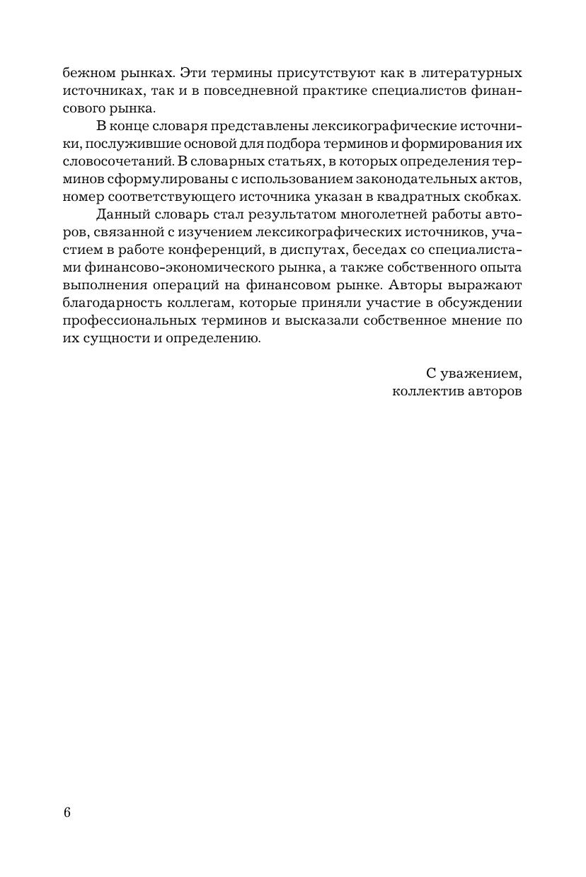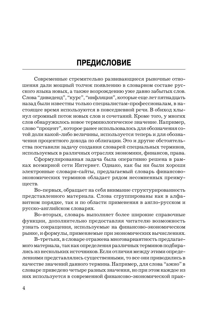 Словарь содержит системно изложенный материал, дающий целостное представление о терминологии финансово-экономического профиля, по следующим разделам: глоссарий, англо-русский и русско-английский словари. В издание включены также приложения: предметный словарь, где термины систематизированы по группам, характеризующим различные области функционирования финансово-экономического рынка; словарь сокращений; словарь сленга, используемого на российском и зарубежном рынках; основные формулы, применяемые при выполнении операций с финансовыми инструментами.