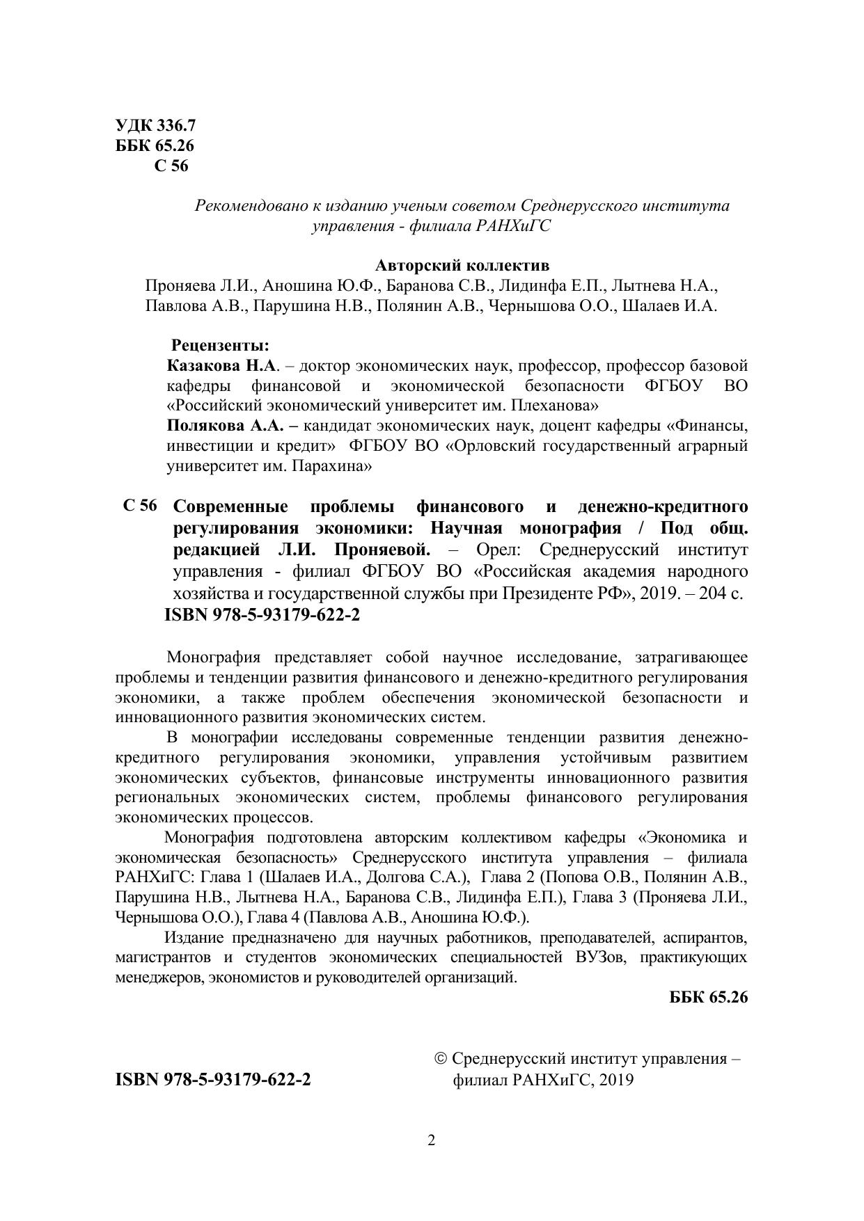 Монография представляет собой научное исследование, затрагивающее проблемы и тенденции развития финансового и денежно-кредитного регулирования экономики, а также проблем обеспечения экономической безопасности и инновационного развития экономических систем. В монографии исследованы современные тенденции развития денежнокредитного регулирования экономики, управления устойчивым развитием экономических субъектов, финансовые инструменты инновационного развития региональных экономических систем, проблемы финансового регулирования экономических процессов. Монография подготовлена авторским коллективом кафедры «Экономика и экономическая безопасность» Среднерусского института управления – филиала РАНХиГС: Глава 1 (Шалаев И.А., Долгова С.А.), Глава 2 (Попова О.В., Полянин А.В., Парушина Н.В., Лытнева Н.А., Баранова С.В., Лидинфа Е.П.), Глава 3 (Проняева Л.И., Чернышова О.О.), Глава 4 (Павлова А.В., Аношина Ю.Ф.). Издание предназначено для научных работников, преподавателей, аспирантов, магистрантов и студентов экономических специальностей ВУЗов, практикующих менеджеров, экономистов и руководителей организаций.