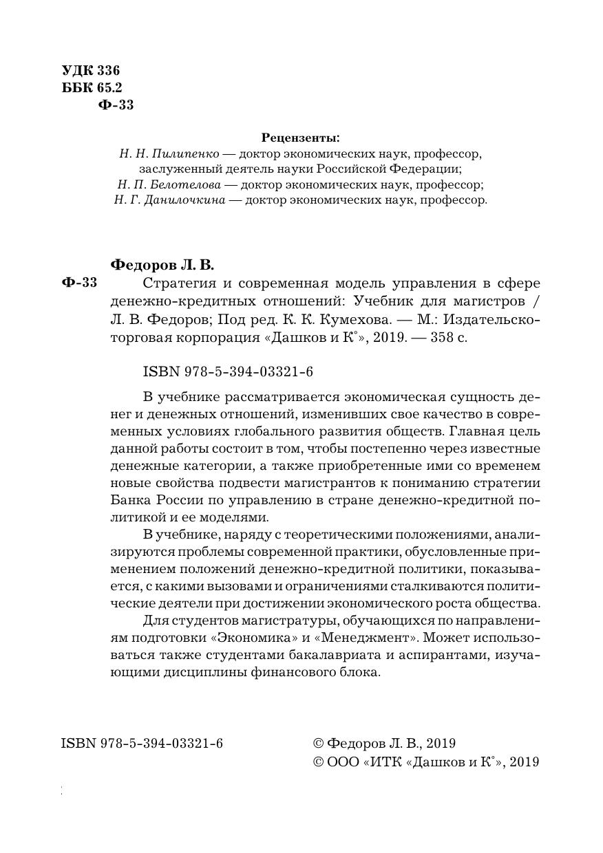 В учебнике рассматривается экономическая сущность денег и денежных отношений, изменивших свое качество в современных условиях глобального развития обществ. Главная цель данной работы состоит в том, чтобы постепенно через известные денежные категории, а также приобретенные ими со временем новые свойства подвести магистрантов к пониманию стратегии Банка России по управлению в стране денежно-кредитной политикой и ее моделями. В учебнике, наряду с теоретическими положениями, анализируются проблемы современной практики, обусловленные применением положений денежно-кредитной политики, показывается, с какими вызовами и ограничениями сталкиваются политические деятели при достижении экономического роста общества. Для студентов магистратуры, обучающихся по направлениям подготовки «Экономика» и «Менеджмент». Может использоваться также студентами бакалавриата и аспирантами, изучающими дисциплины финансового блока.