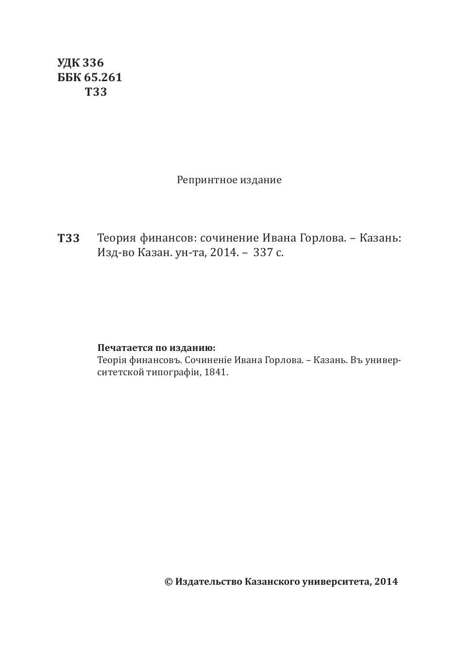 По изданию: Теорiя финансовъ. Сочиненiе Ивана Горлова. – Казань. Въ университетской типографiи, 1841.