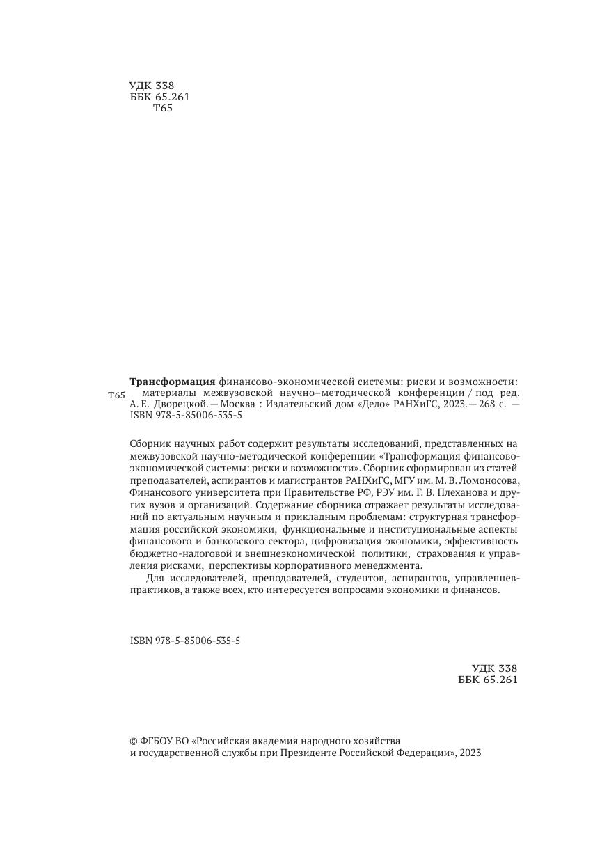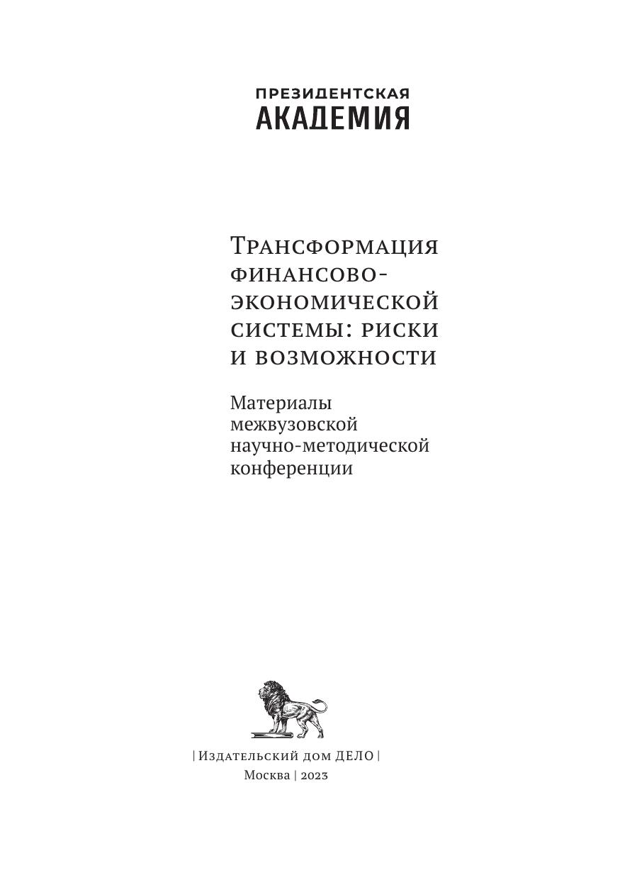 Сборник научных работ содержит результаты исследований, представленных на межвузовской научно-методической конференции «Трансформация финансово-экономической системы: риски и возможности». Сборник сформирован из статей преподавателей, аспирантов и магистрантов РАНХиГС, МГУ им. М. В. Ломоносова, Финансового университета при Правительстве РФ, РЭУ им. Г. В. Плеханова и других вузов и организаций. Содержание сборника отражает результаты исследований по актуальным научным и прикладным проблемам: структурная трансформация российской экономики, функциональные и институциональные аспекты финансового и банковского сектора, цифровизация экономики, эффективность бюджетно-налоговой и внешнеэкономической политики, страхования и управления рисками, перспективы корпоративного менеджмента. Для исследователей, преподавателей, студентов, аспирантов, управленцев-практиков, а также всех, кто интересуется вопросами экономики и финансов.