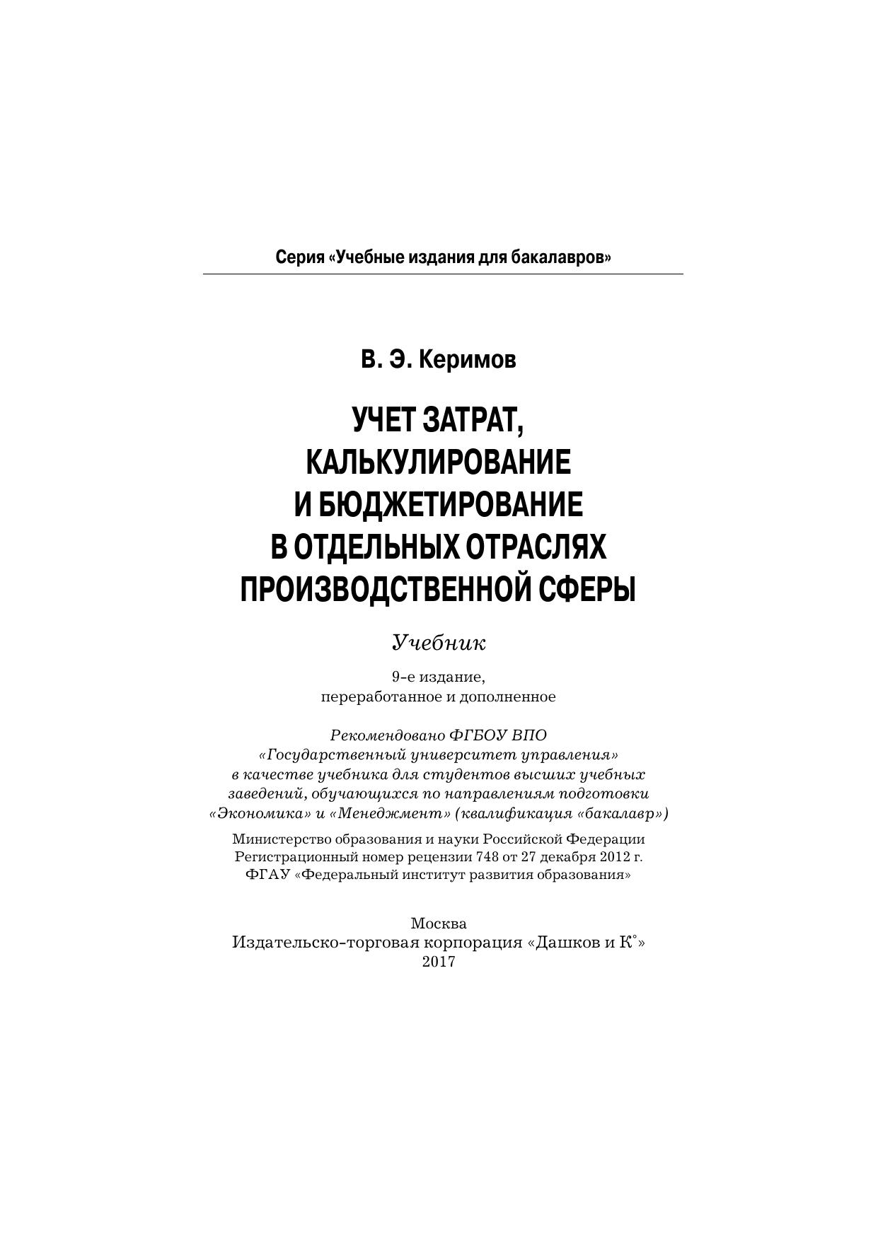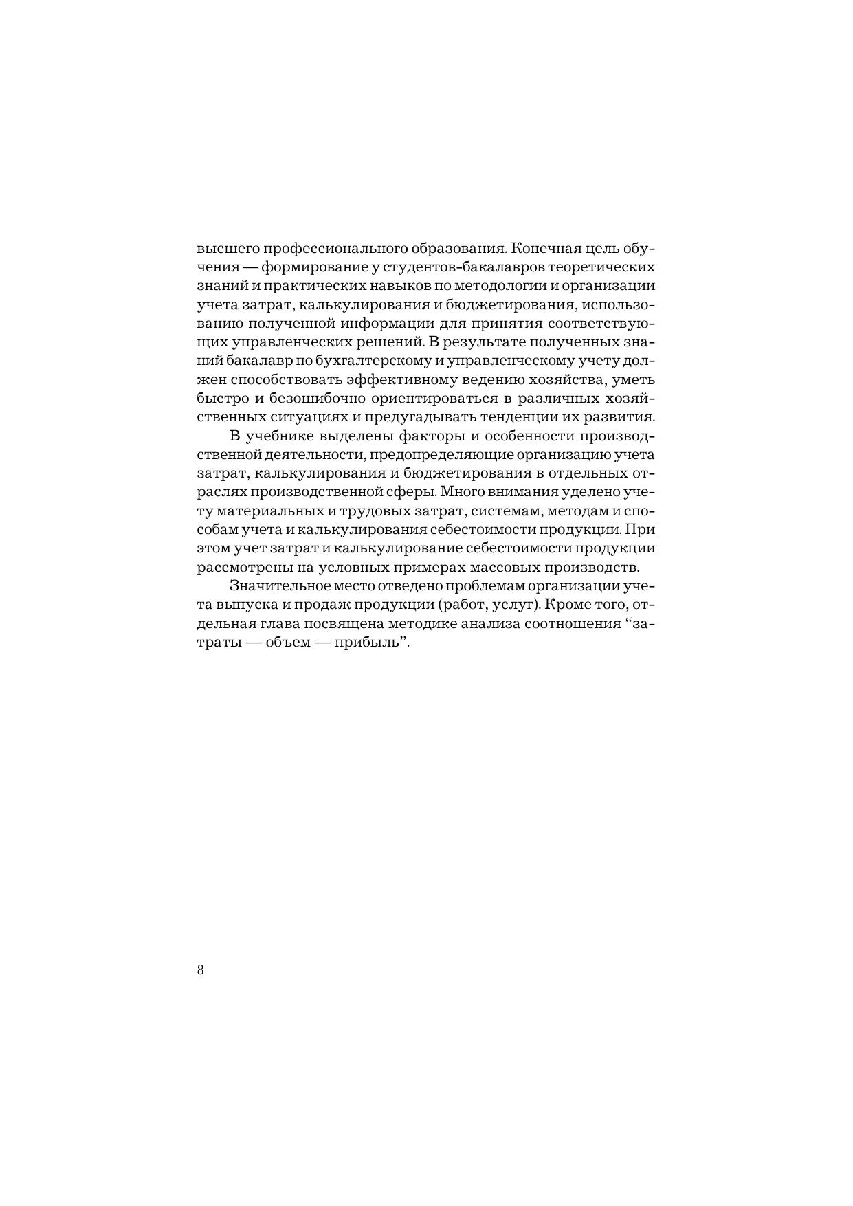 В учебнике изложены теоретические основы и практические аспекты организации учета затрат, калькулирования и бюджетирования в отдельных отраслях производственной сферы. Основное внимание уделено системам, методам и способам учета затрат и калькулирования себестоимости продукции. На условных примерах рассмотрена методика анализа соотношения “затраты — объем — прибыль”. Каждая глава учебника завершается вопросами для самопроверки и тестовыми заданиями. Для студентов бакалавриата, обучающихся по направлениям подготовки «Экономика» и «Менеджмент», а также преподавателей, аспирантов и профессиональных бухгалтеров.