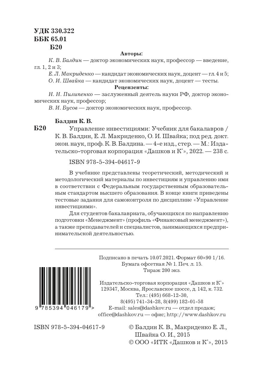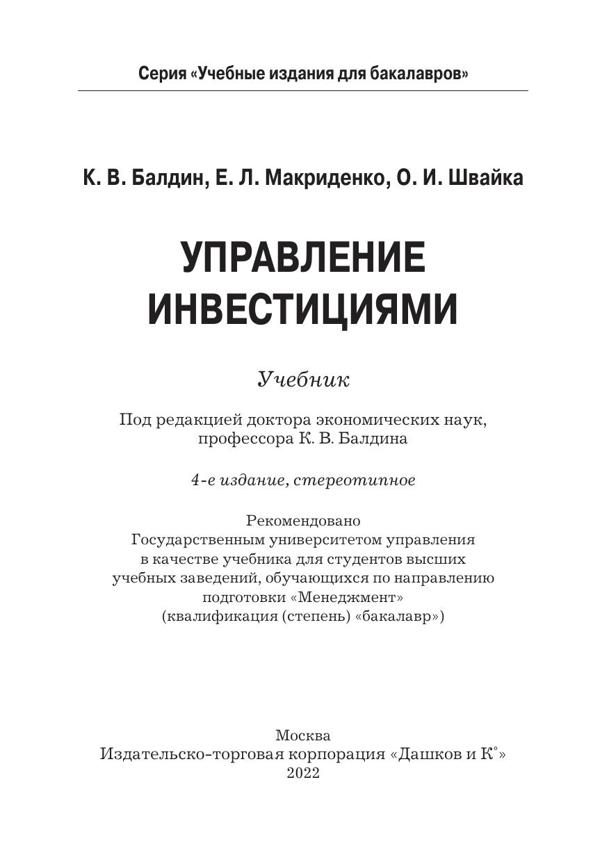 В учебнике представлены теоретический, методический и методологический материалы по инвестициям и управлению ими в соответствии с Федеральным государственным образовательным стандартом. В конце книги приведены тестовые задания для самоконтроля по дисциплине "Управление инвестициями". Для студентов бакалавриата, обучающихся по направлению подготовки "Менеджмент" и профилю подготовки "Финансовый менеджмент" (квалификация "бакалавр"), а также преподавателей и специалистов, занимающихся предпринимательской и коммерческой деятельностью.