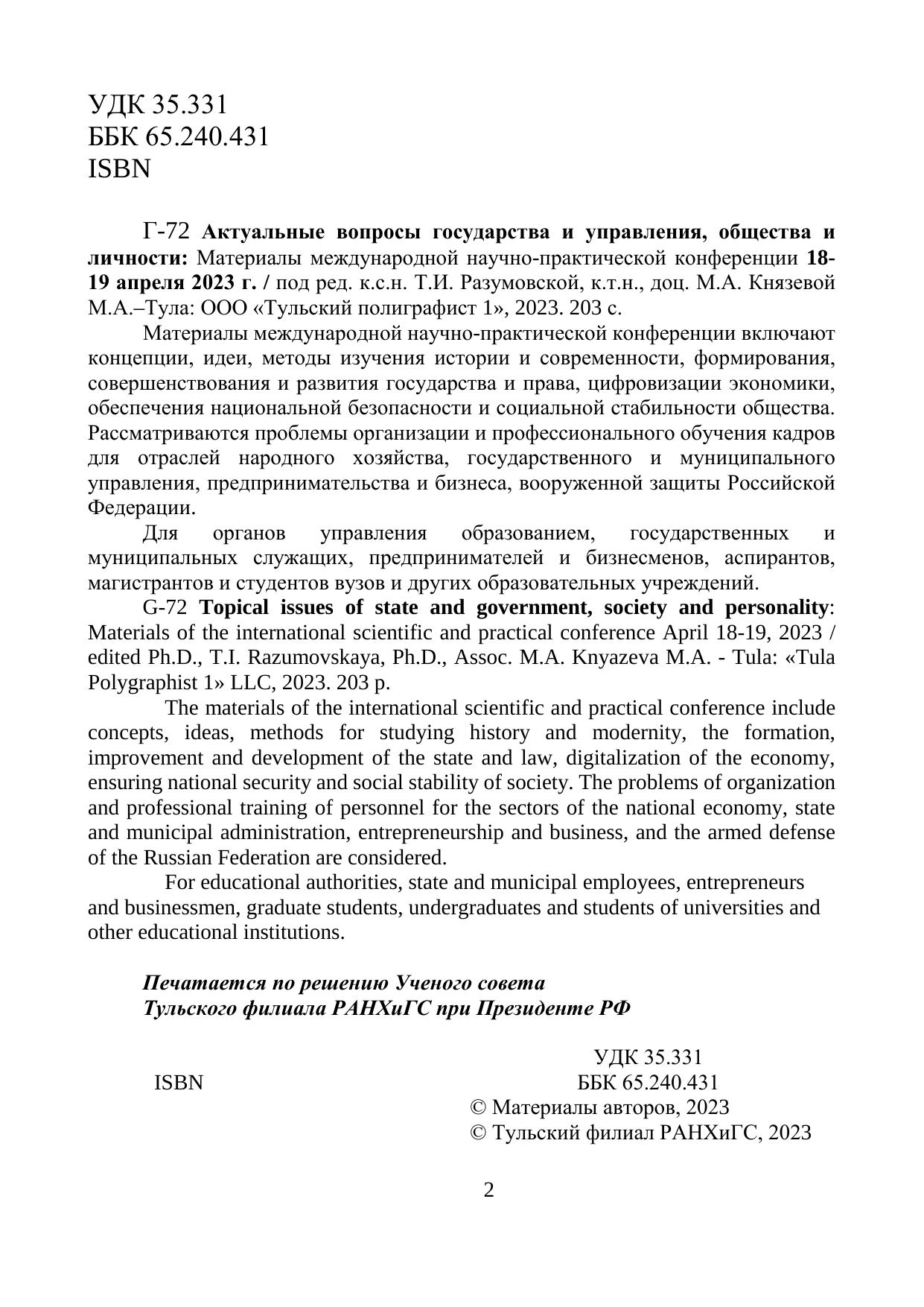 Материалы международной научно-практической конференции включают концепции, идеи, методы изучения истории и современности, формирования, совершенствования и развития государства и права, цифровизации экономики, обеспечения национальной безопасности и социальной стабильности общества. Рассматриваются проблемы организации и профессионального обучения кадров для отраслей народного хозяйства, государственного и муниципального управления, предпринимательства и бизнеса, вооруженной защиты Российской Федерации. Для органов управления образованием, государственных и муниципальных служащих, предпринимателей и бизнесменов, аспирантов, магистрантов и студентов вузов и других образовательных учреждений.