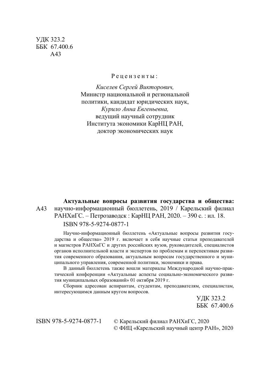 Научно-информационный бюллетень «Актуальные вопросы развития государства и общества» 2019 г. включает в себя научные статьи преподавателей и магистров РАНХиГС и других российских вузов, руководителей, специалистов органов исполнительной власти и экспертов по проблемам и перспективам развития современного образования, актуальным вопросам государственного и муниципального управления, современной политики, экономики и права. В данный бюллетень также вошли материалы Международной научно-практической конференции «Актуальные аспекты социально-экономического развития муниципальных образований» 01 октября 2019 г. Сборник адресован аспирантам, студентам, преподавателям, специалистам, интересующимся данным кругом вопросов.