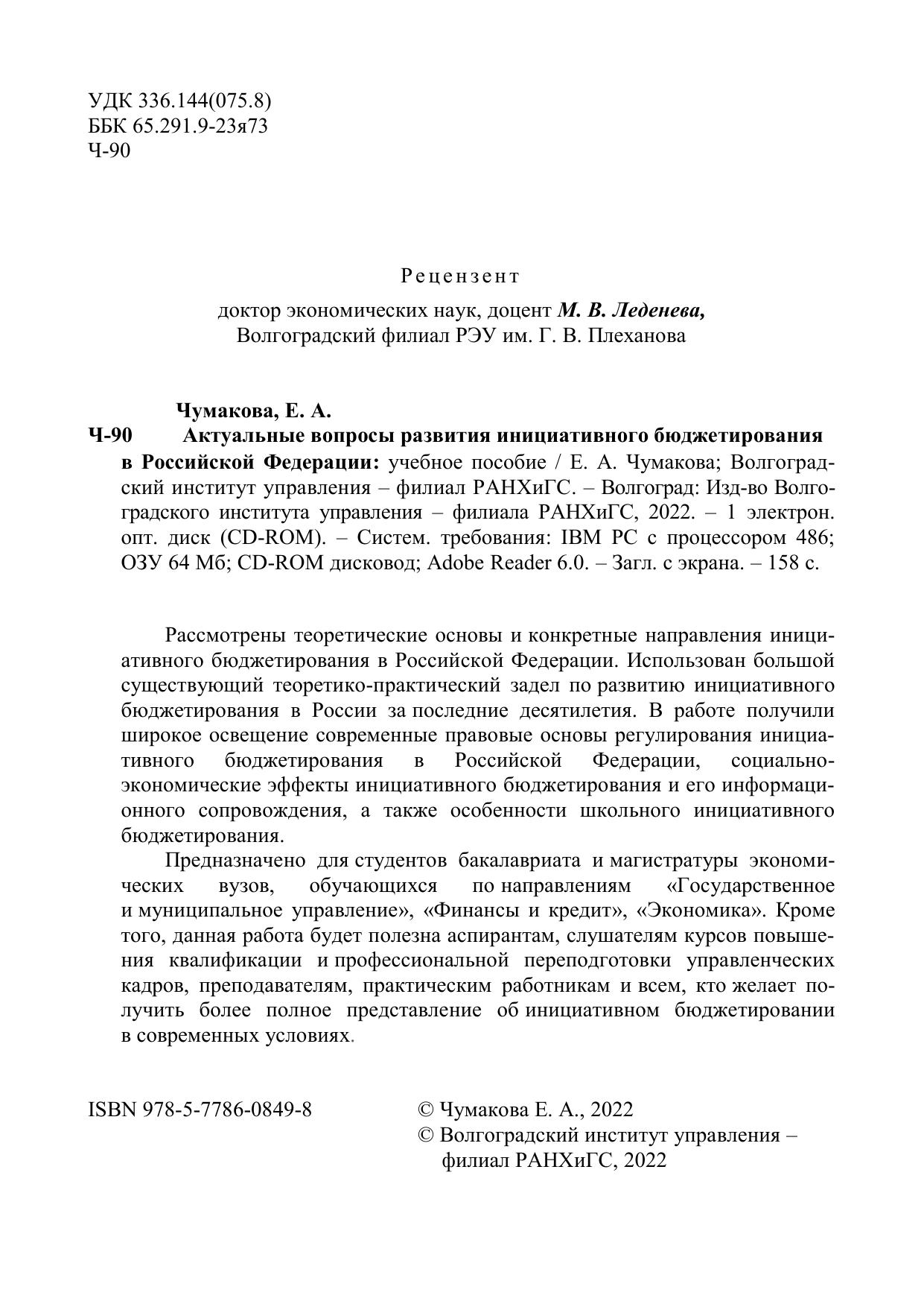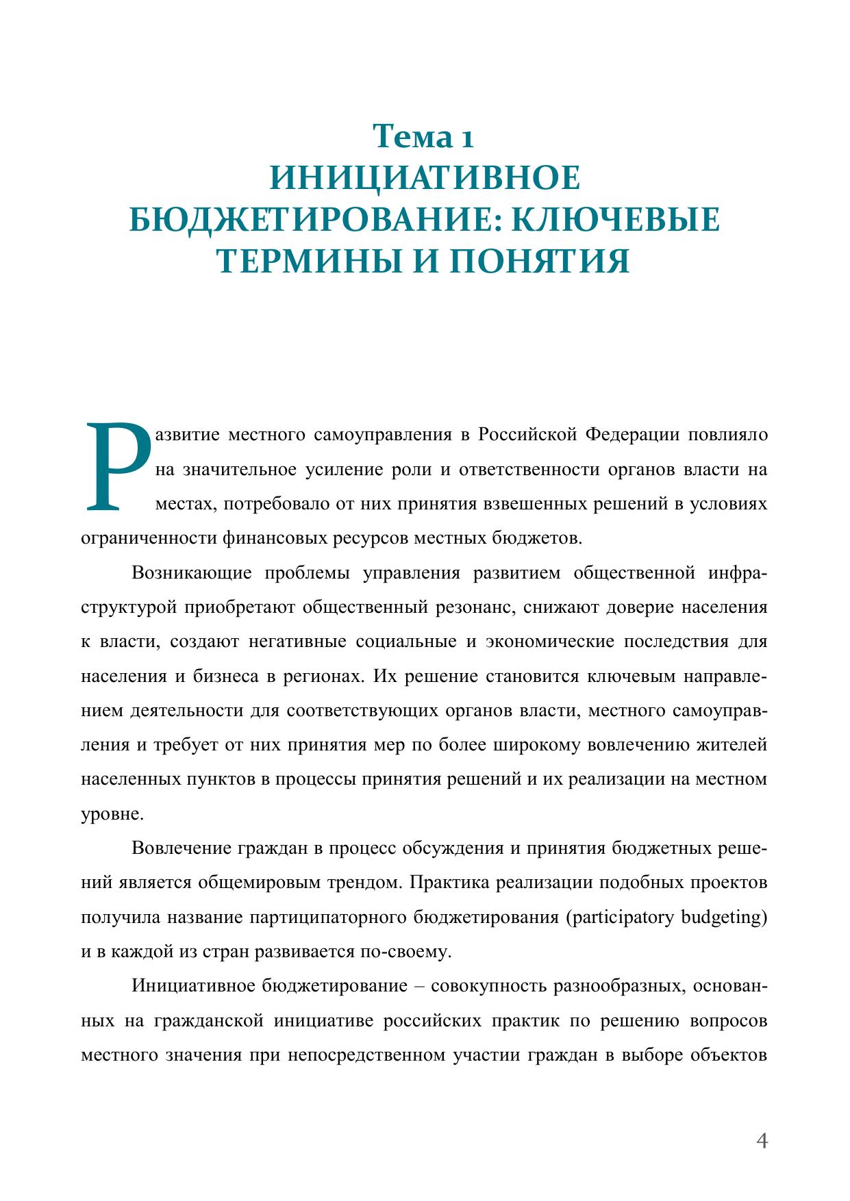 Рассмотрены теоретические основы и конкретные направления иници-ативного бюджетирования в Российской Федерации. Использован большой существующий теоретико-практический задел по развитию инициативного бюджетирования в России за последние десятилетия. В работе получили широкое освещение современные правовые основы регулирования инициа-тивного бюджетирования в Российской Федерации, социально-экономические эффекты инициативного бюджетирования и его информаци-онного сопровождения, а также особенности школьного инициативного бюджетирования. Предназначено для студентов бакалавриата и магистратуры экономи-ческих вузов, обучающихся по направлениям «Государственное и муниципальное управление», «Финансы и кредит», «Экономика». Кроме того, данная работа будет полезна аспирантам, слушателям курсов повыше-ния квалификации и профессиональной переподготовки управленческих кадров, преподавателям, практическим работникам и всем, кто желает по-лучить более полное представление об инициативном бюджетировании в современных условиях.