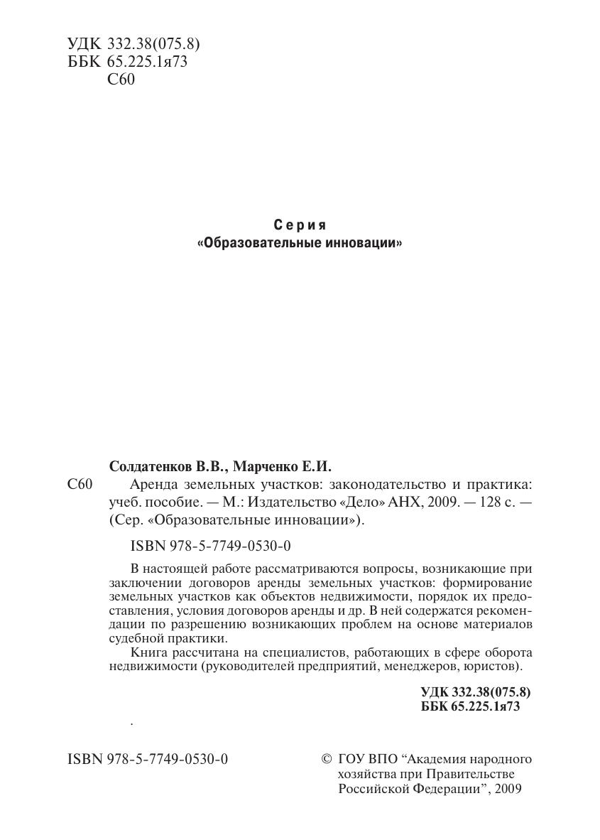 Серия Образовательные инновации. В настоящей работе рассматриваются вопросы, возникающие при заключении договоров аренды земельных участков: формирование земельных участков как объектов недвижимости, порядок их предоставления, условия договоров аренды и др. В ней содержатся рекомендации по разрешению возникающих проблем на основе материалов судебной практики. Книга рассчитана на специалистов, работающих в сфере оборота недвижимости (руководителей предприятий, менеджеров, юристов)