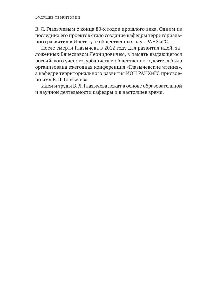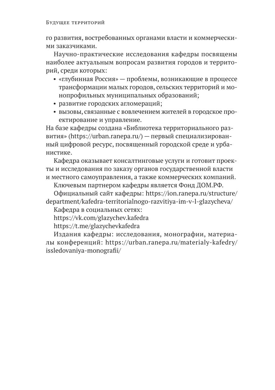 Коллективная монография посвящена актуальным подходам к городскому развитию: проблемам и перспективам внедрения механизма комплексного развития территорий, современным инструментам взаимодействия инициаторов проектов развития с заинтересованными сторонами, возможностям использования творческих индустрий и креативного предпринимательства в качестве ресурсов развития территорий. Научное издание подготовлено на кафедре территориального развития им. В. Л. Глазычева ИОН РАНХиГС в рамках ежегодной конференции «Глазычевские чтения» — 2022 при поддержке Фонда ДОМ.РФ. Издание адресовано исследователям, научным сотрудникам и специалистам в сфере управления городским и территориальным развитием.