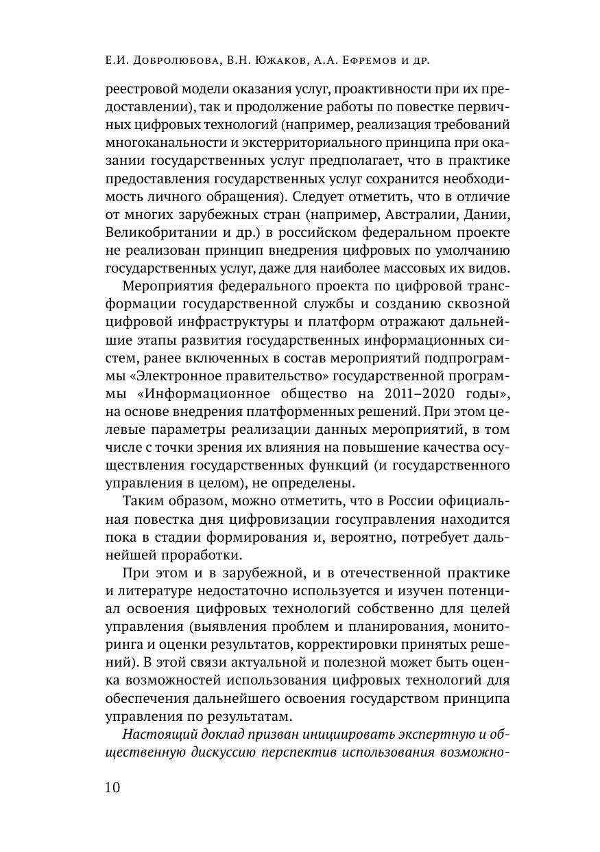 Доклад подготовлен коллективом Центра технологий государственного управления Института прикладных экономических исследований Российской академии народного хозяйства и государственной службы при Президенте Российской Федерации. В докладе рассматриваются теоретические и практические подходы к цифровой трансформации государственного управления в интересах обеспечения и повышения его результативности. Авторы оценивают влияние цифровизации на качество государственного управления и показывают сильную взаимосвязь между показателями развития электронного правительства, с одной стороны, и результативностью государственного управления – с другой. На основе анализа зару бежного опыта использования цифровых технологий при планировании, мониторинге и оценке результатов в государственном управлении проведена оценка потенциала использования таких технологий в российской практике. В докладе показано, что цифровые технологии позволяют преодолеть проблемы при освоении государственными органами управления по результатам, возникшие и выявленные ранее, а цифровая трансформация может стать драйвером для внедрения новой модели государственного управления – государственного управления по результатам. Произойдет это или нет, зависит от того, в какой степени на практике удастся снять ограничения внедрения цифровых технологий в целом и в государственном управлении в частности.