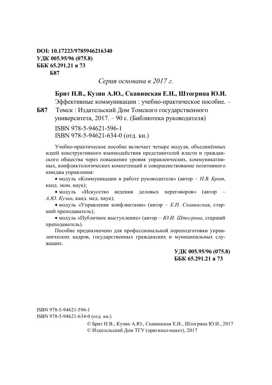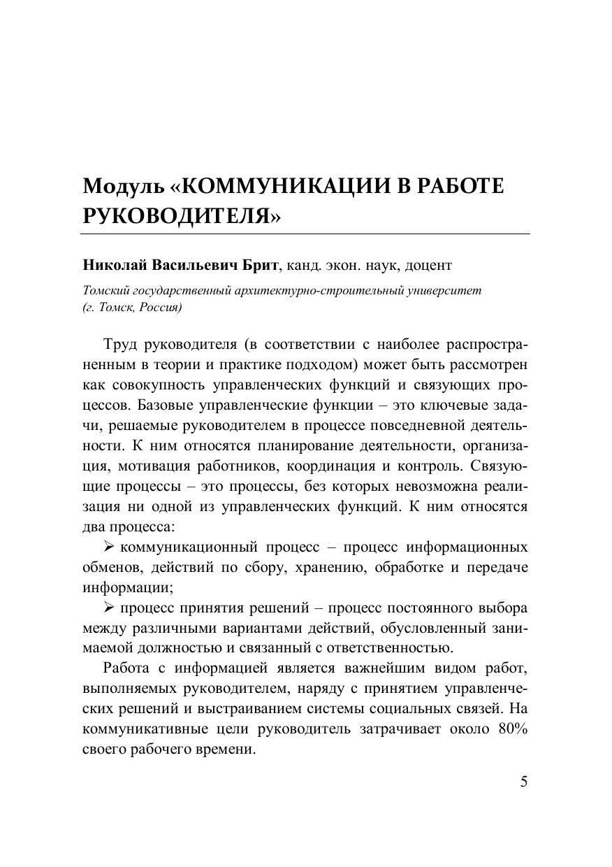 Учебно-практическое пособие включает четыре модуля, объединённых идеей конструктивного взаимодействия представителей власти и гражданского общества через повышение уровня управленческих, коммуникативных, конфликтологических компетенций и совершенствование позитивного имиджа управления: модуль «Коммуникации в работе руководителя» (автор – Н.В. Брит, канд. экон. наук), модуль «Искусство ведения деловых переговоров» (автор – А.Ю. Кузин, канд. мед. наук), модуль «Управление конфликтами» (автор – Е.Н. Скавинская, старший преподаватель), модуль «Публичное выступление» (автор – Ю.И. Штогрина, старший преподаватель). Пособие предназначено для профессиональной переподготовки управленческих кадров, государственных гражданских и муниципальных служащих.