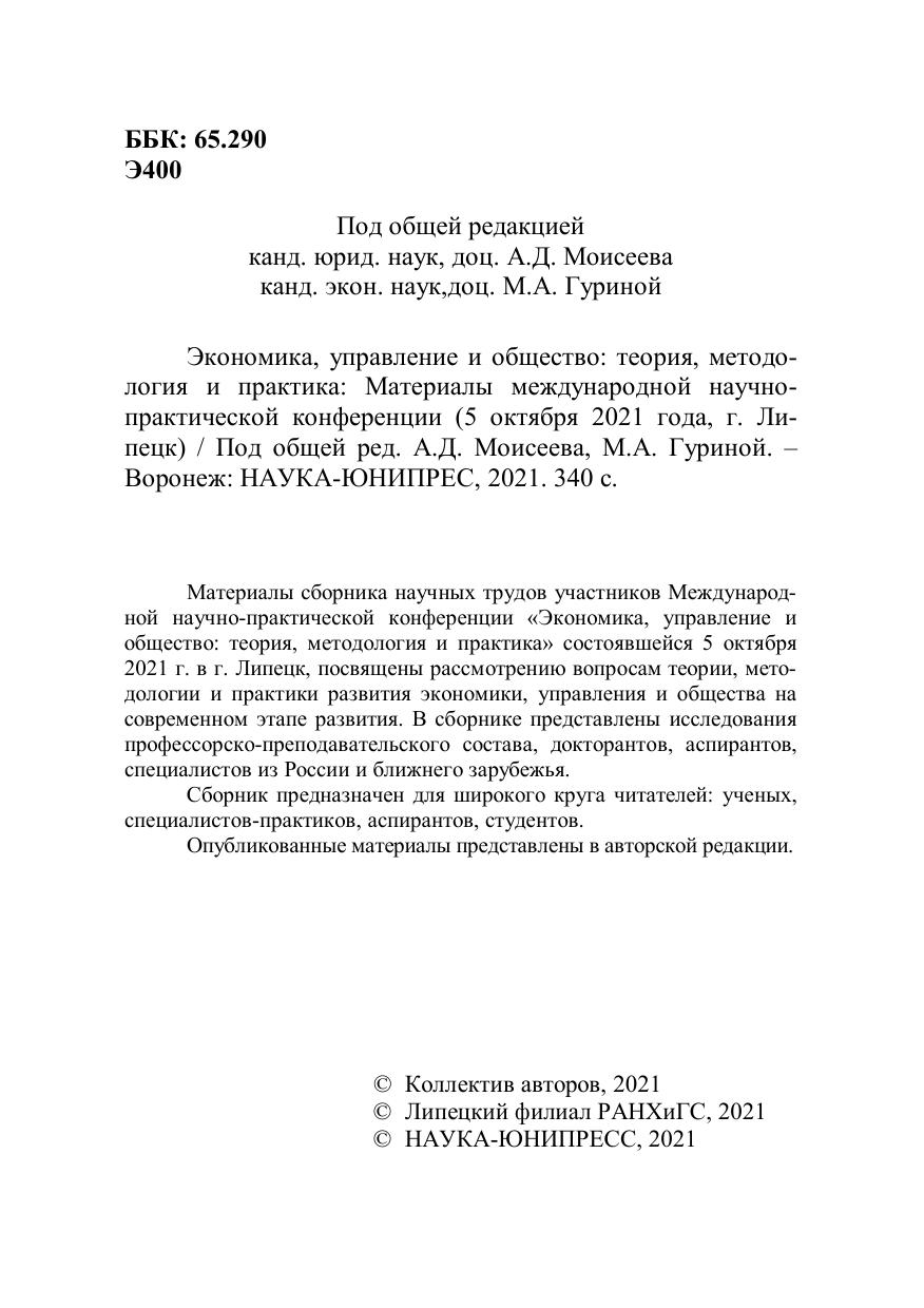 Экономика, управление и общество: теория, методология и практика: Материалы международной научно-практической конференции (5 октября 2021 года, г. Липецк)