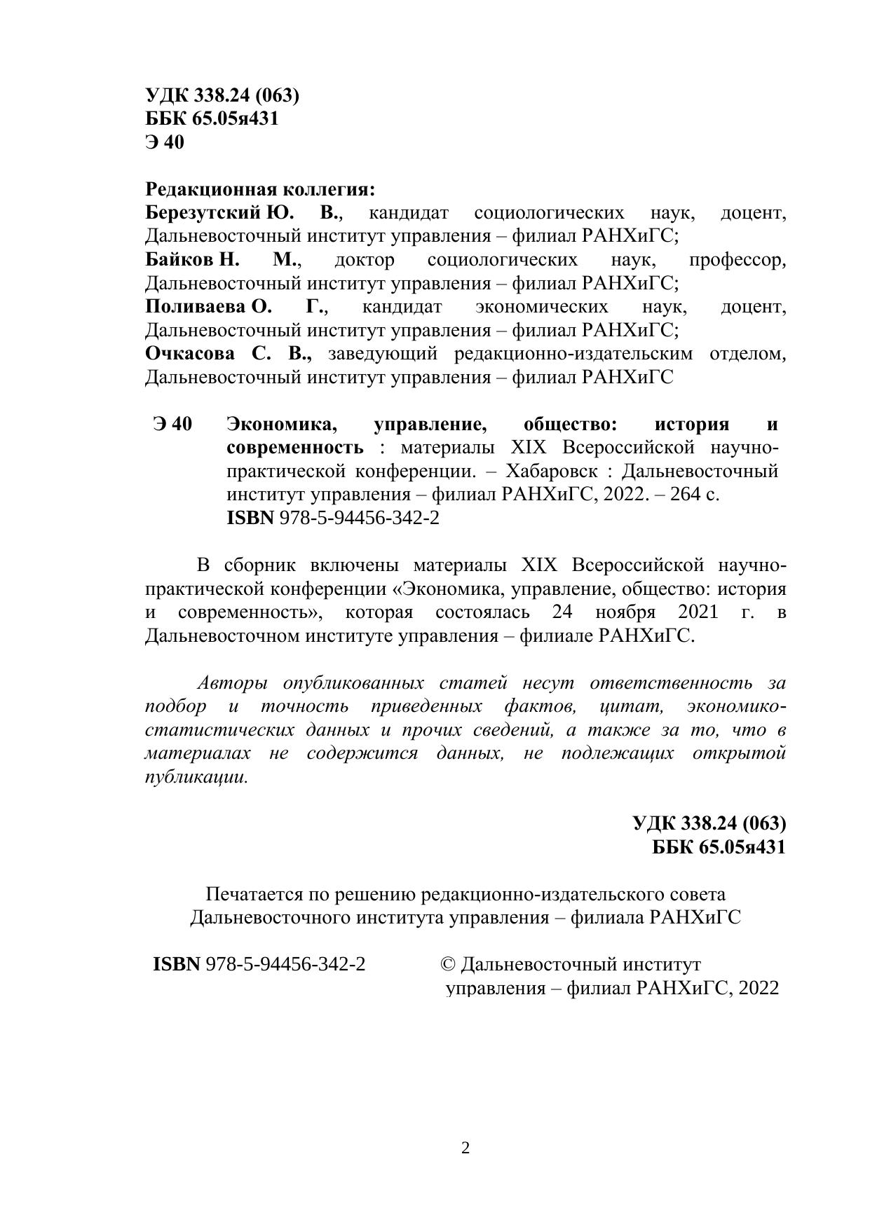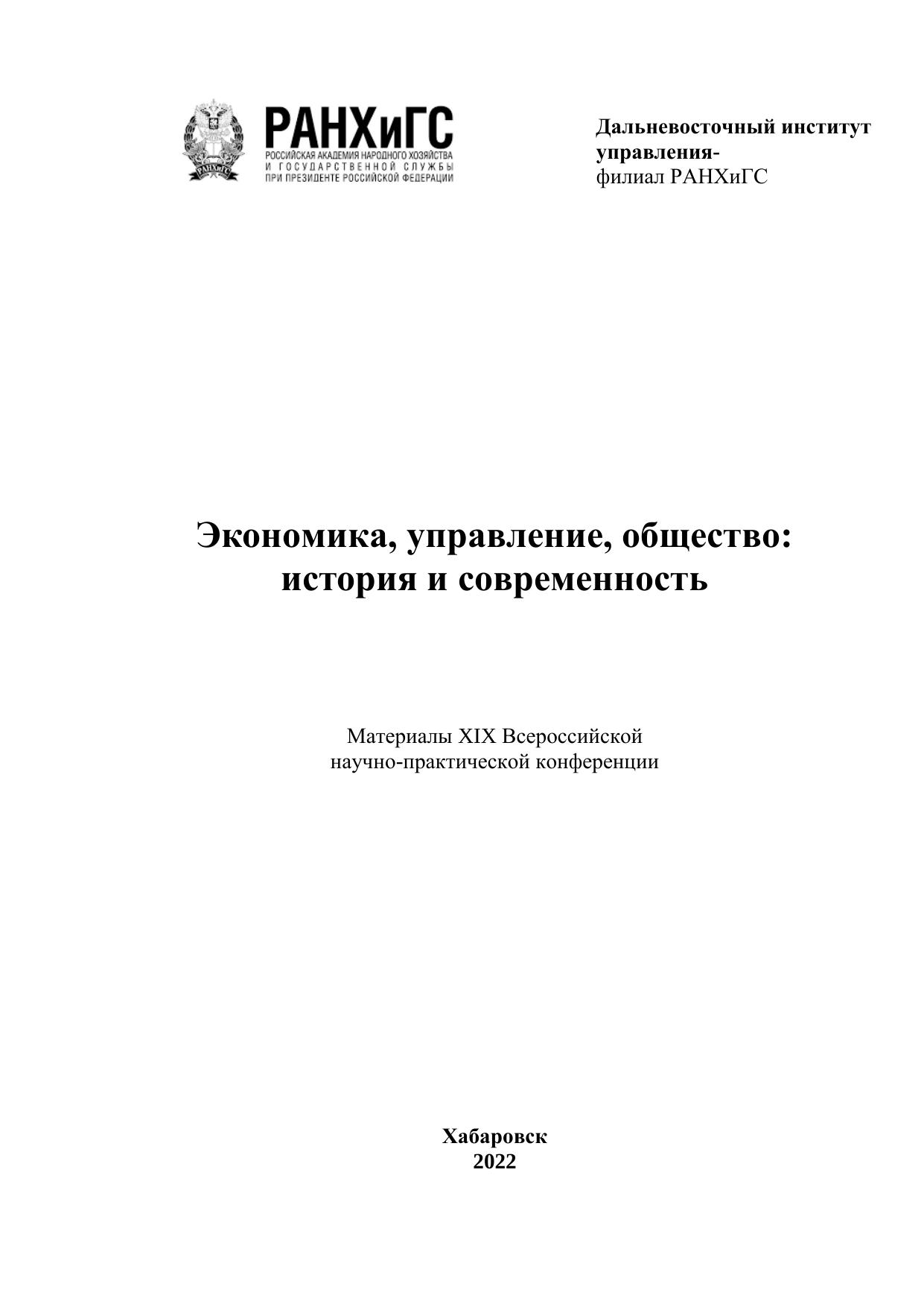 В сборник включены материалы XIX Всероссийской научнопрактической конференции «Экономика, управление, общество: история и современность», которая состоялась 24 ноября 2021 г. в Дальневосточном институте управления – филиале РАНХиГС.