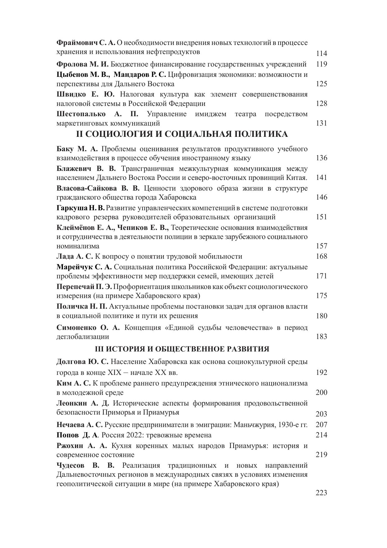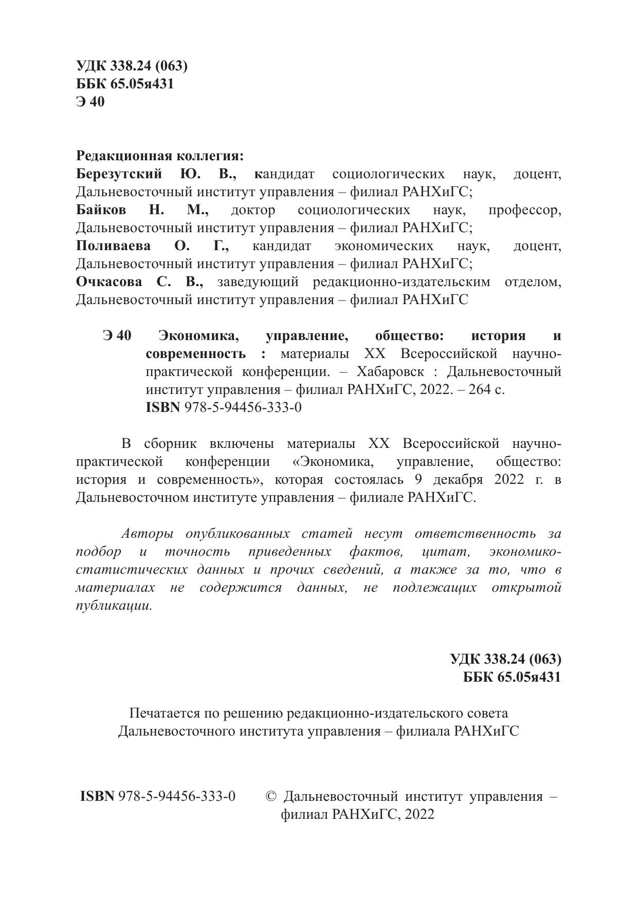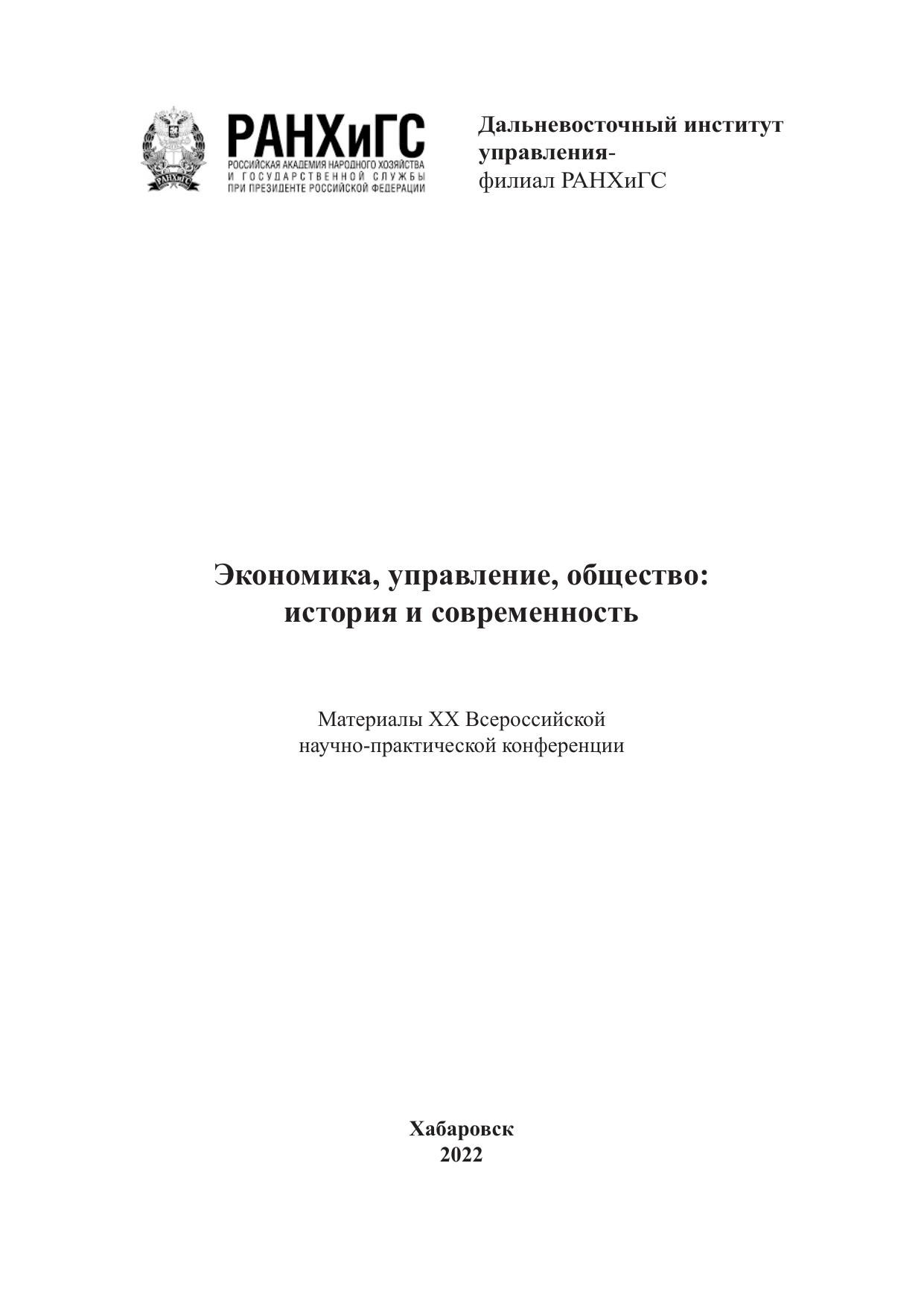 В сборник включены материалы XX Всероссийской научнопрактической конференции «Экономика, управление, общество: история и современность», которая состоялась 9 декабря 2022 г. в Дальневосточном институте управления – филиале РАНХиГС.