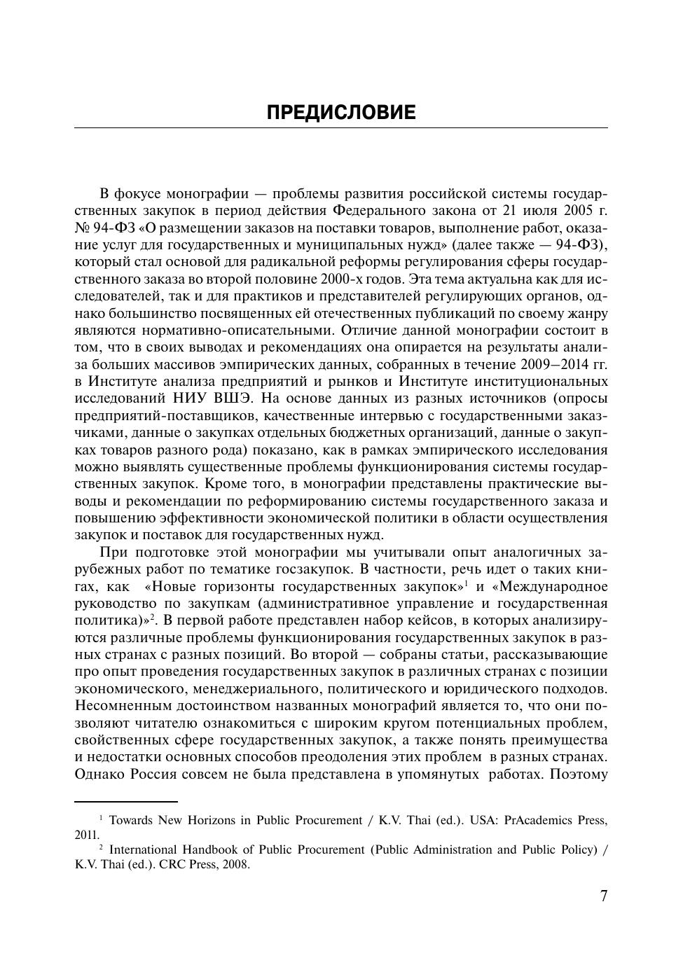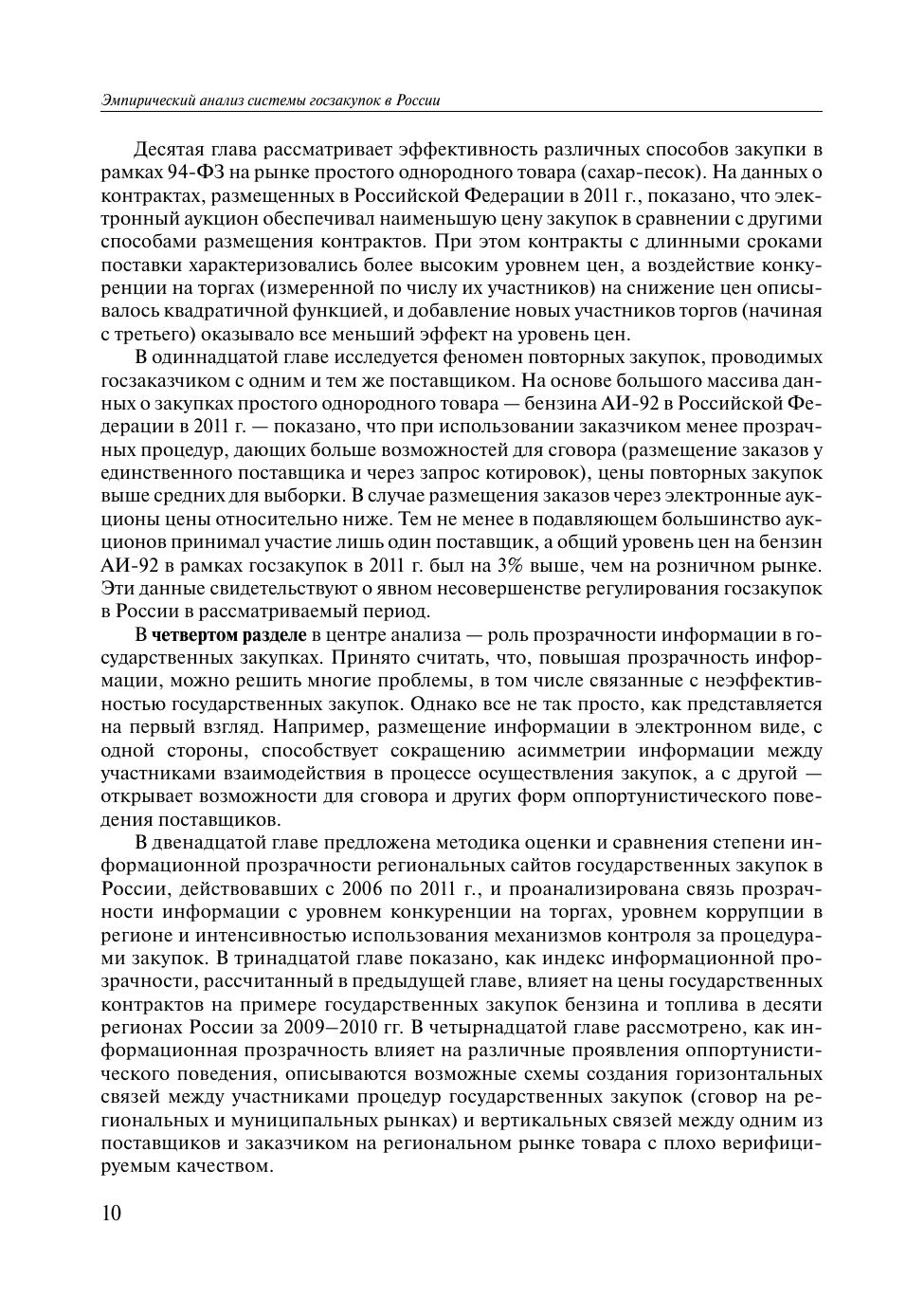 Монография посвящена анализу развития российской системы государственных закупок в период действия Закона о госзакупках № 94-ФЗ, который стал основой для радикальной реформы регулирования сферы государственного заказа во второй половине 2000-х годов. В отличие от множества преимущественно нормативно-описательных отечественных публикаций по тематике госзакупок, в этой книге выводы и рекомендации опираются на результаты анализа больших массивов эмпирических данных. Эти данные были собраны в течение 2009–2014 гг. в Институте анализа предприятий и рынков и Институте институциональных исследований НИУ ВШЭ и включают опросы предприятий-поставщиков, качественные интервью с государственными заказчиками, а также доступную из официальных источников информацию о закупках отдельных бюджетных организаций и о закупках разных категорий товаров. В монографии показано, как в рамках эмпирического исследования можно выявлять проблемы функционирования системы государственных закупок и обосновывать возможные решения этих проблем. Результаты и методология исследований, положенных в основу монографии, будут важны в ближайшие годы для аналитической поддержки контрактной системы, создаваемой в соответствии с Законом № 44-ФЗ. Книга предназначена для преподавателей вузов и бизнес-школ, а также аспирантов и студентов, обучающихся по специальностям «Экономика», «Менеджмент», «Государственное и муниципальное управление»; для специалистов, вовлеченных в планирование и управление процессами госзакупок в федеральных и региональных органах власти, на предприятиях-поставщиках и в организациях-заказчиках.