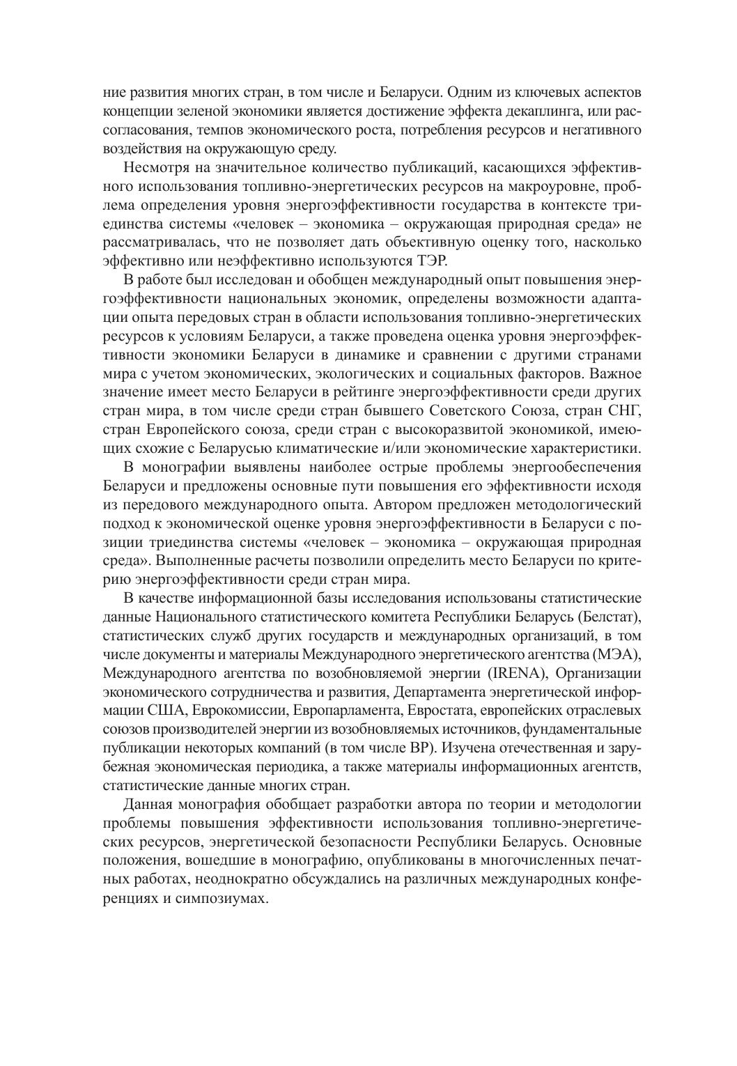 В книге проанализированы основные мировые тенденции производства и потребления топливно-энергетических ресурсов. Предложен методологический подход к оценке уровня энергоэффективности экономики с позиции триединства «человек – экономика – окружающая природная среда». По разработанной авторской методике выполнен сопоставительный анализ энергоэффективности экономики Беларуси по сравнению со странами мира. Предложены направления повышения эффективности использования топливно- энергетических ресурсов для снижения энергозависимости и обеспечения энергетической безопасности Беларуси.