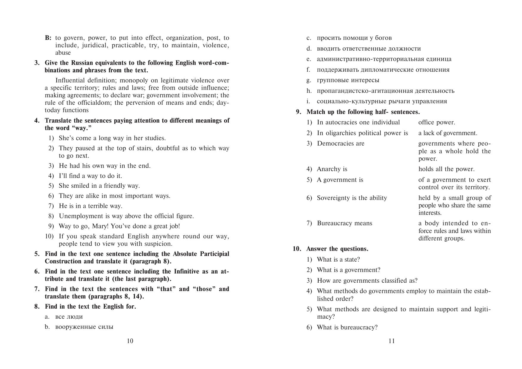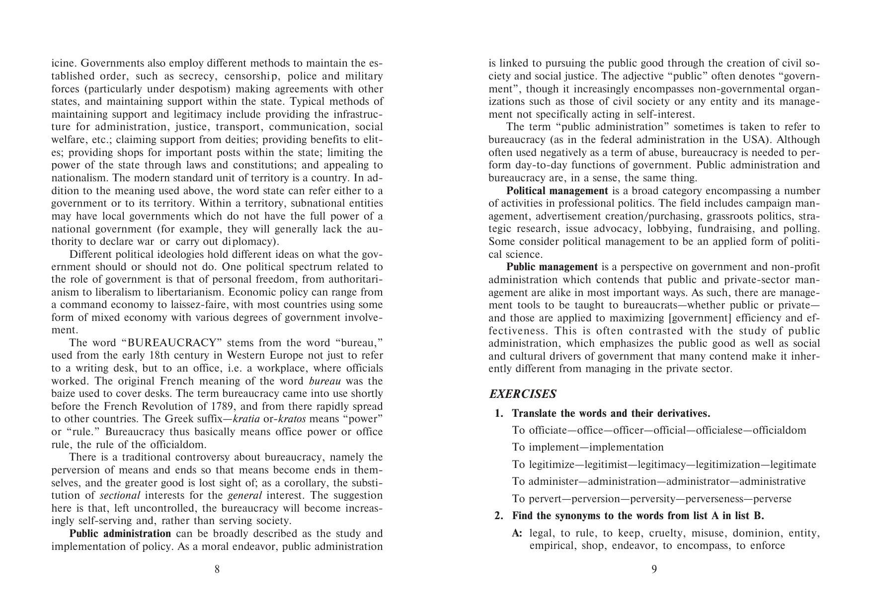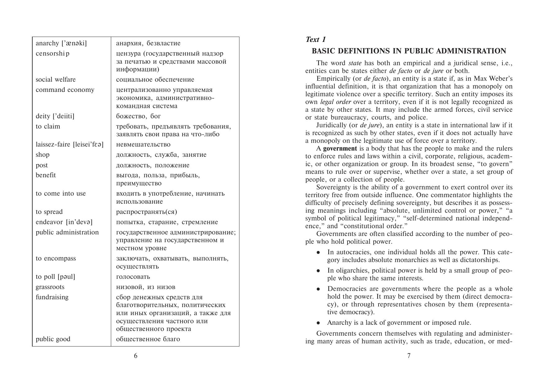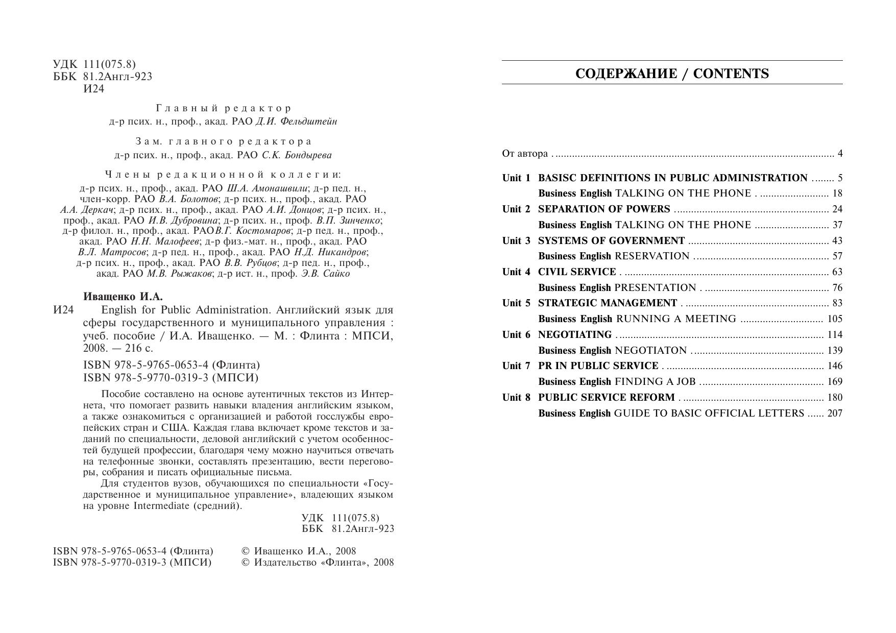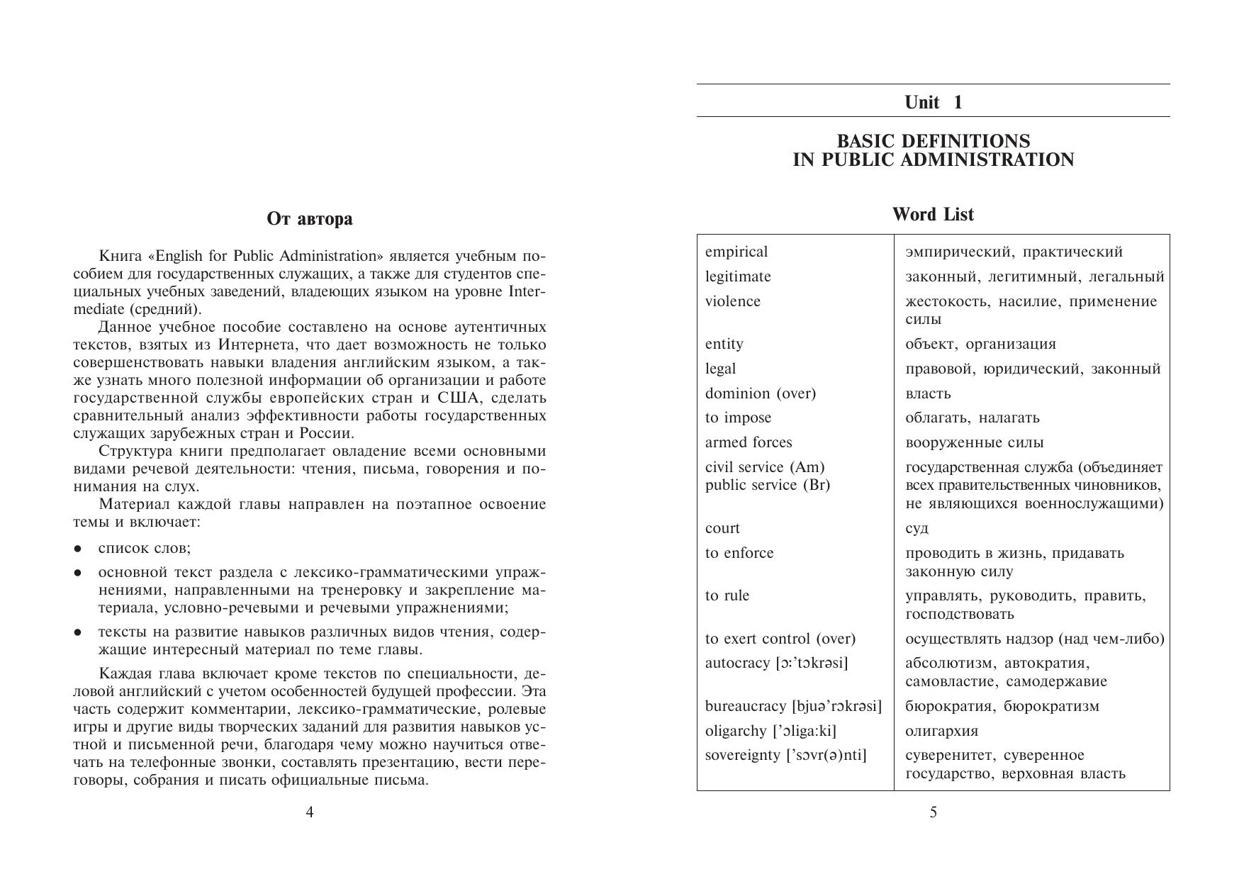 Пособие составлено на основе аутентичных текстов из Интернета, что помогает развить навыки владения английским языком, а также ознакомиться с организацией и работой госслужбы европейских стран и США. Каждая глава включает кроме текстов и заданий по специальности, деловой английский с учетом особенностей будущей профессии, благодаря чему можно научиться отвечать на телефонные звонки, составлять презентацию, вести переговоры, собрания и писать официальные письма. Для студентов вузов, обучающихся по специальности "Государственное и муниципальное управление", владеющих языком на уровне Intermediate (средний).