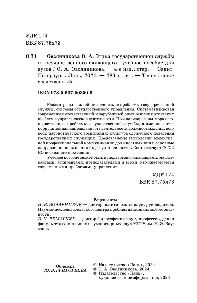 Рассмотрены важнейшие этические проблемы государственной службы, системы государственного управления. Систематизирован современный отечественный и зарубежный опыт решения этических проблем в управленческой деятельности. Проанализированы морально-нравственные проблемы государственной службы, а именно: антикоррупционная направленность деятельности должностных лиц, вопросы патриотического воспитания, культура служебного поведения государственных служащих. Представлены технологии эффективной профессиональной коммуникации должностных лиц и основные направления повышения их результативности. Соответствует ФГОС ВО последнего поколения.Учебное пособие может быть использовано бакалаврами, магистрантами, аспирантами, преподавателями и всеми, кто интересуется современными проблемами управления.