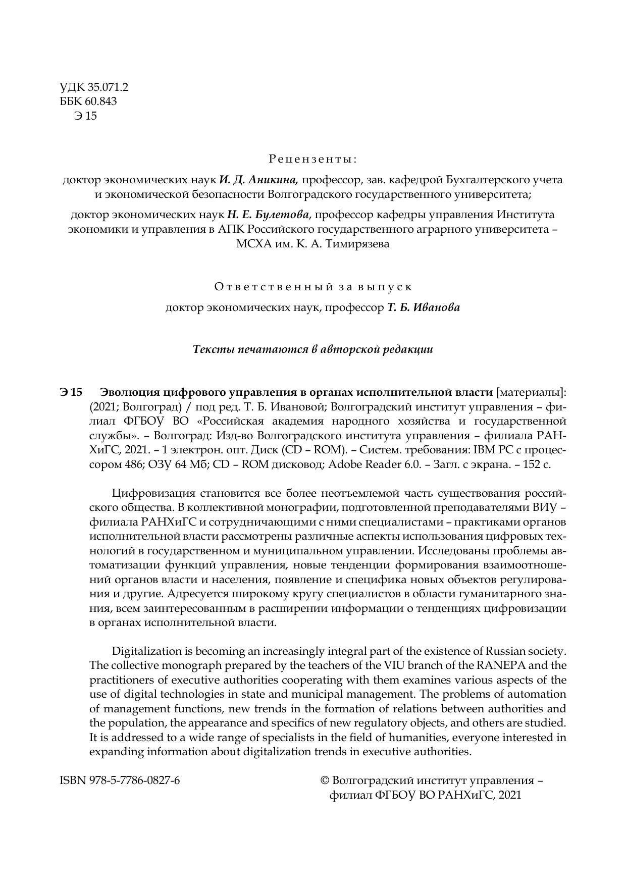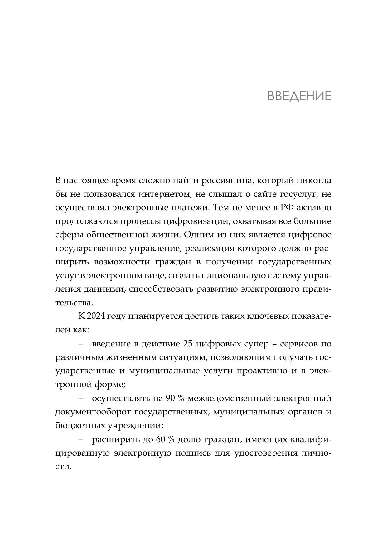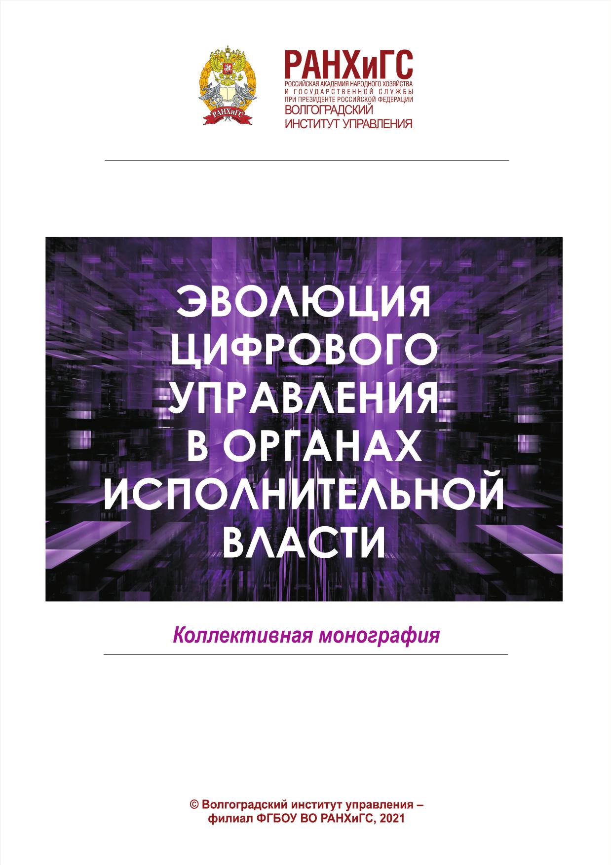Цифровизация становится все более неотъемлемой часть существования российского общества. В коллективной монографии, подготовленной преподавателями ВИУ – филиала РАНХиГС и сотрудничающими с ними специалистами – практиками органов исполнительной власти рассмотрены различные аспекты использования цифровых технологий в государственном и муниципальном управлении. Исследованы проблемы автоматизации функций управления, новые тенденции формирования взаимоотношений органов власти и населения, появление и специфика новых объектов регулирования и другие. Адресуется широкому кругу специалистов в области гуманитарного знания, всем заинтересованным в расширении информации о тенденциях цифровизации в органах исполнительной власти.