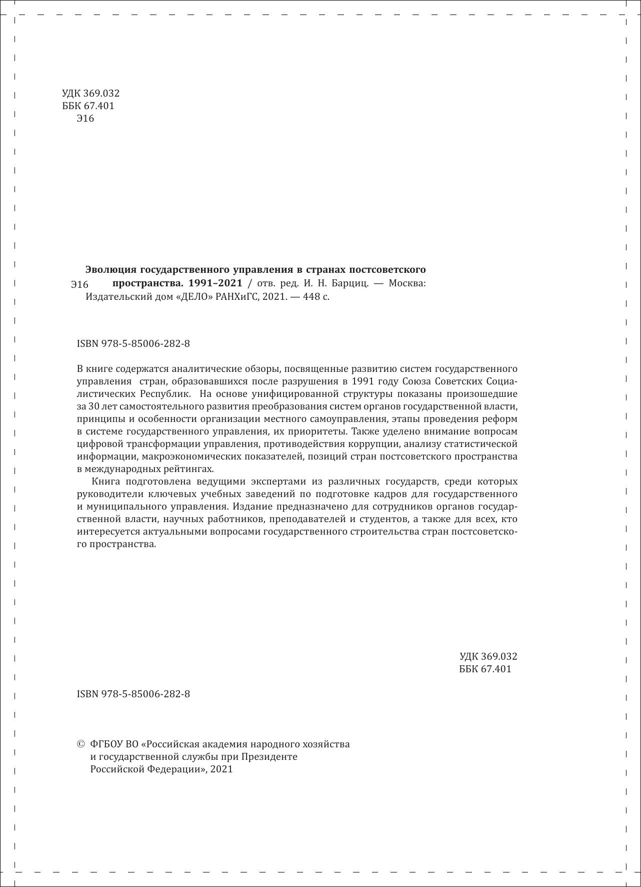 В книге содержатся аналитические обзоры, посвященные развитию систем государственного управления стран, образовавшихся после разрушения в 1991 году Союза Советских Социалистических Республик. На основе унифицированной структуры показаны произошедшие за 30 лет самостоятельного развития преобразования систем органов государственной власти, принципы и особенности организации местного самоуправления, этапы проведения реформ в системе государственного управления, их приоритеты. Также уделено внимание вопросам цифровой трансформации управления, противодействия коррупции, анализу статистической информации, макроэкономических показателей, позиций стран постсоветского пространства в международных рейтингах.
