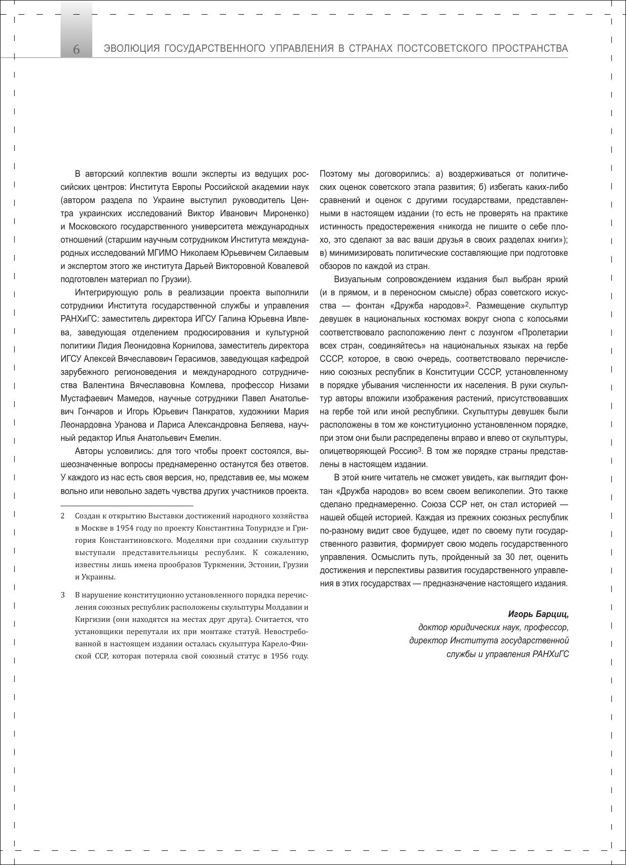 Книга подготовлена ведущими экспертами из различных государств, среди которых руководители ключевых учебных заведений по подготовке кадров для государственного и муниципального управления. Издание предназначено для сотрудников органов государственной власти, научных работников, преподавателей и студентов, а также для всех, кто интересуется актуальными вопросами государственного строительства стран постсоветского пространства.