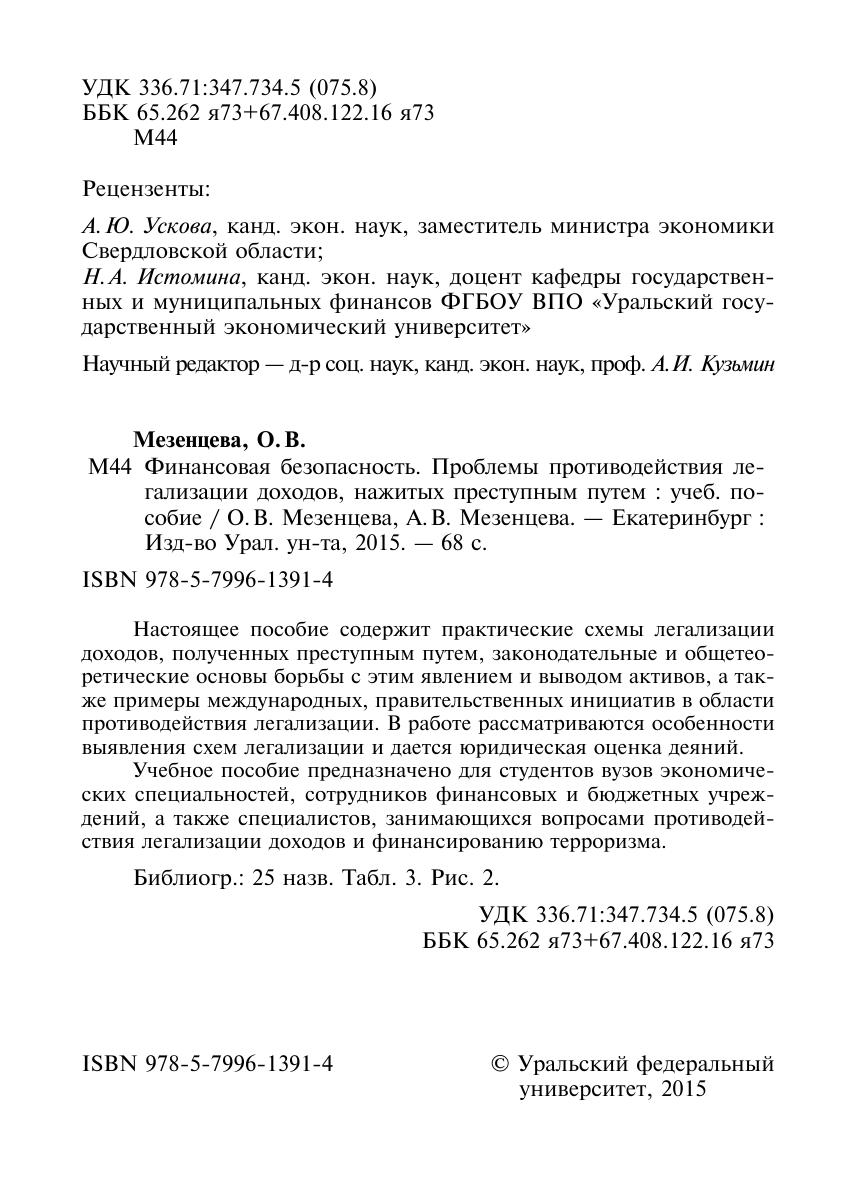 Настоящее пособие содержит практические схемы легализации доходов, полученных преступным путем, законодательные и общетеоретические основы борьбы с этим явлением и выводом активов, а также примеры международных, правительственных инициатив в области противодействия легализации. В работе рассматриваются особенности выявления схем легализации и дается юридическая оценка деяний. Учебное пособие предназначено для студентов вузов экономических специальностей, сотрудников финансовых и бюджетных учреждений, а также специалистов, занимающихся вопросами противодействия легализации доходов и финансированию терроризма.