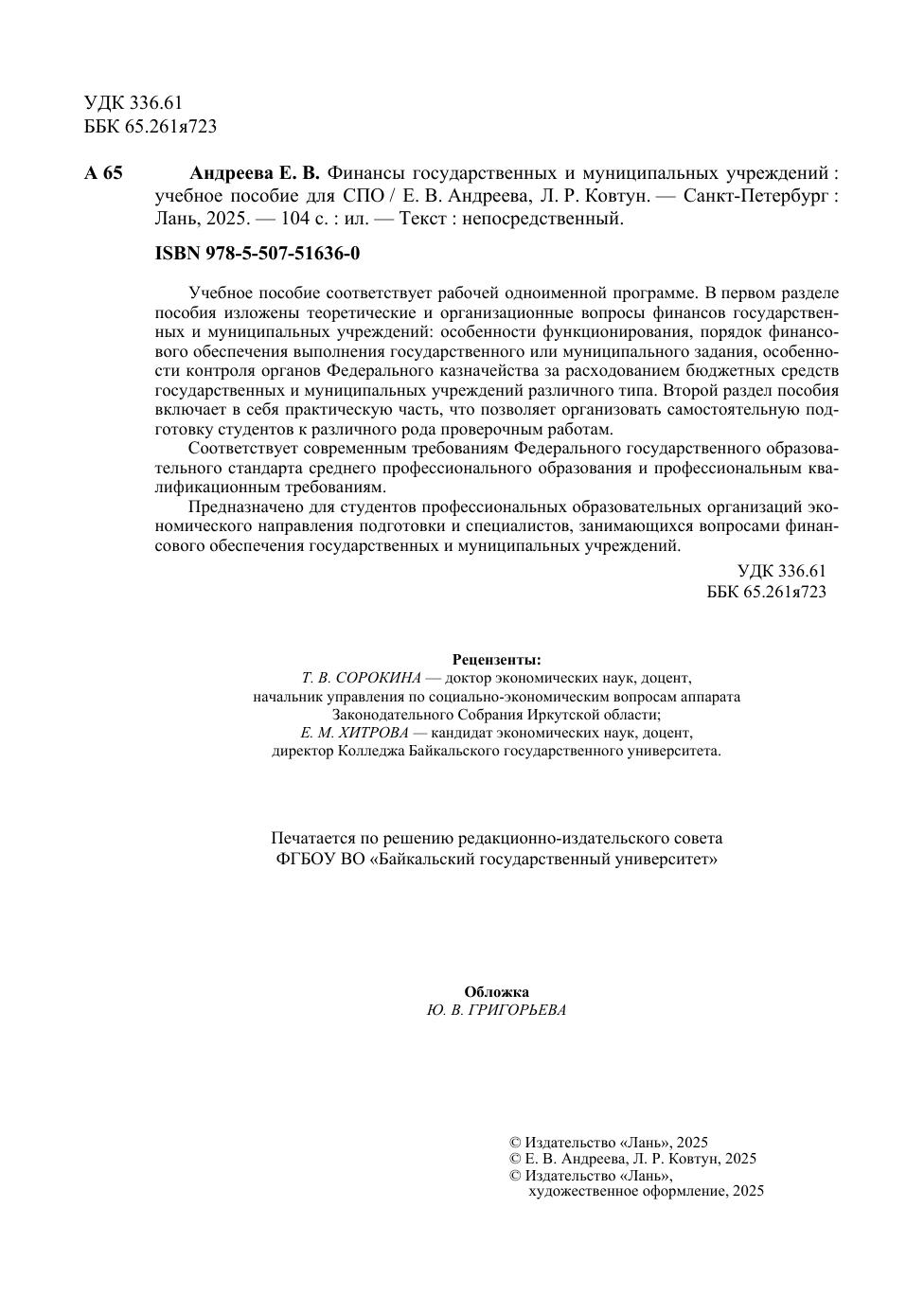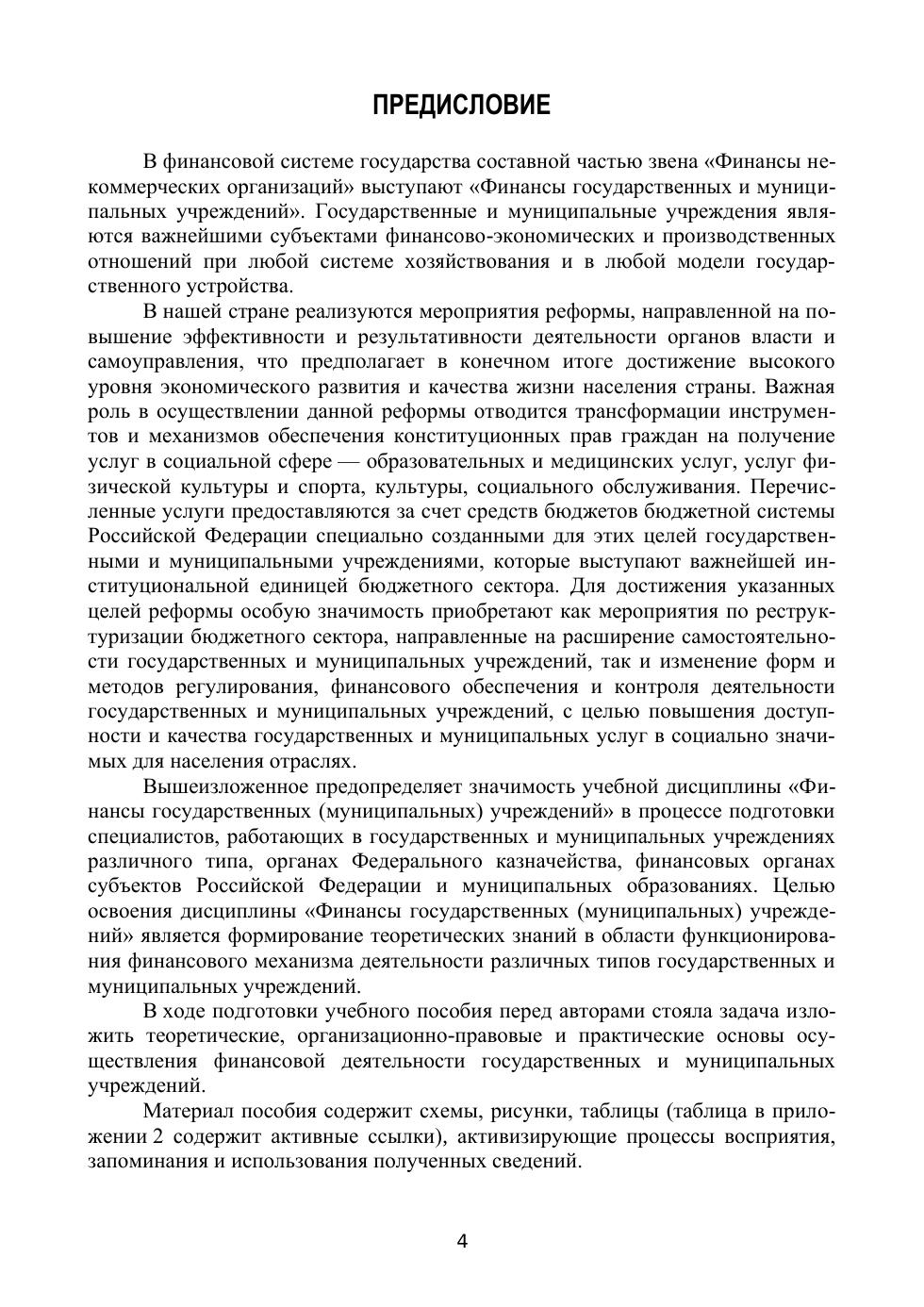 Учебное пособие соответствует рабочей программе одноименной дисциплины. В первом разделе пособия изложены теоретические и организационные вопросы финансов государственных и муниципальных учреждений: особенности функционирования, порядок финансового обеспечения выполнения государственного или муниципального задания, особенности контроля органов Федерального казначейства за расходованием бюджетных средств государственных и муниципальных учреждений различного типа. Второй раздел пособия включает в себя практическую часть, что позволяет организовать самостоятельную подготовку студентов к различного рода проверочным работам. Соответствует современным требованиям Федерального государственного образовательного стандарта среднего профессионального образования и профессиональным квалификационным требованиям. Предназначено для студентов профессиональных образовательных организаций экономического направления подготовки и специалистов, занимающихся вопросами финансового обеспечения государственных и муниципальных учреждений.