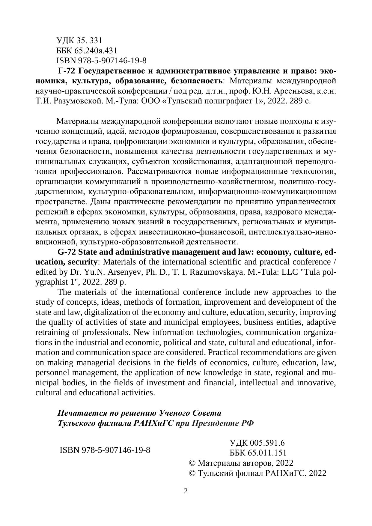 Материалы международной конференции включают новые подходы к изу-чению концепций, идей, методов формирования, совершенствования и развития государства и права, цифровизации экономики и культуры, образования, обеспе-чения безопасности, повышения качества деятельности государственных и му-ниципальных служащих, субъектов хозяйствования, адаптационной переподго-товки профессионалов. Рассматриваются новые информационные технологии, организации коммуникаций в производственно-хозяйственном, политико-госу-дарственном, культурно-образовательном, информационно-коммуникационном пространстве. Даны практические рекомендации по принятию управленческих решений в сферах экономики, культуры, образования, права, кадрового менедж-мента, применению новых знаний в государственных, региональных и муници-пальных органах, в сферах инвестиционно-финансовой, интеллектуально-инно-вационной, культурно-образовательной деятельности.