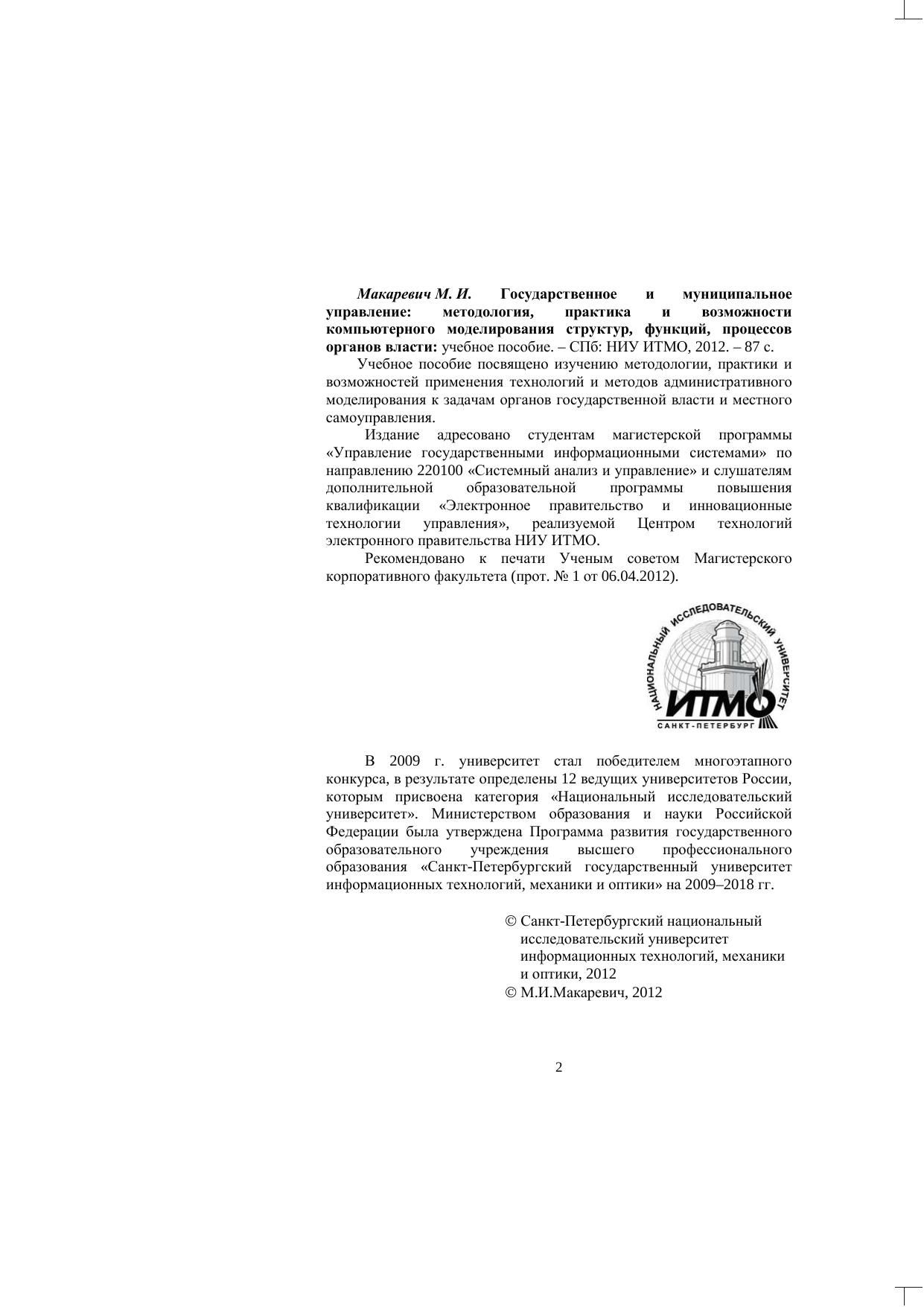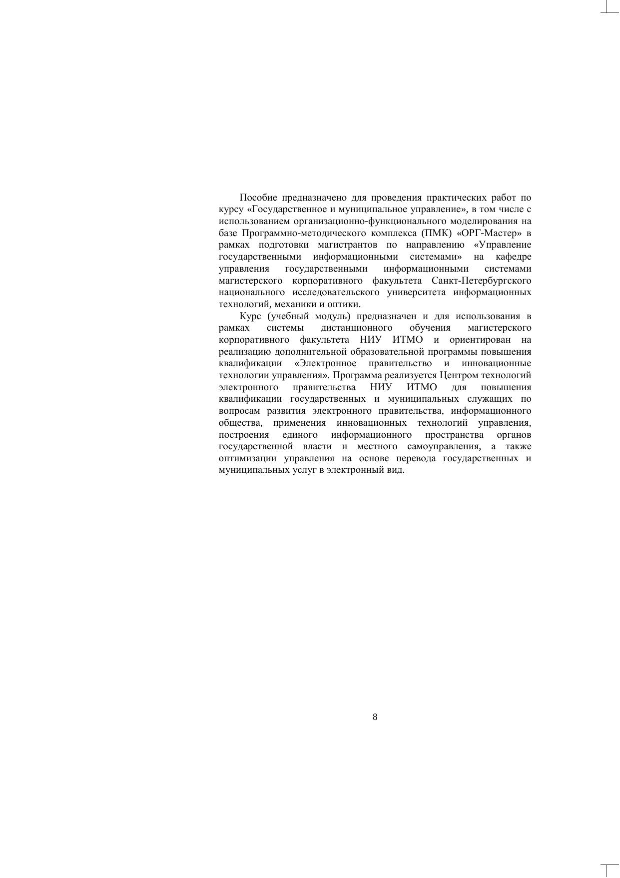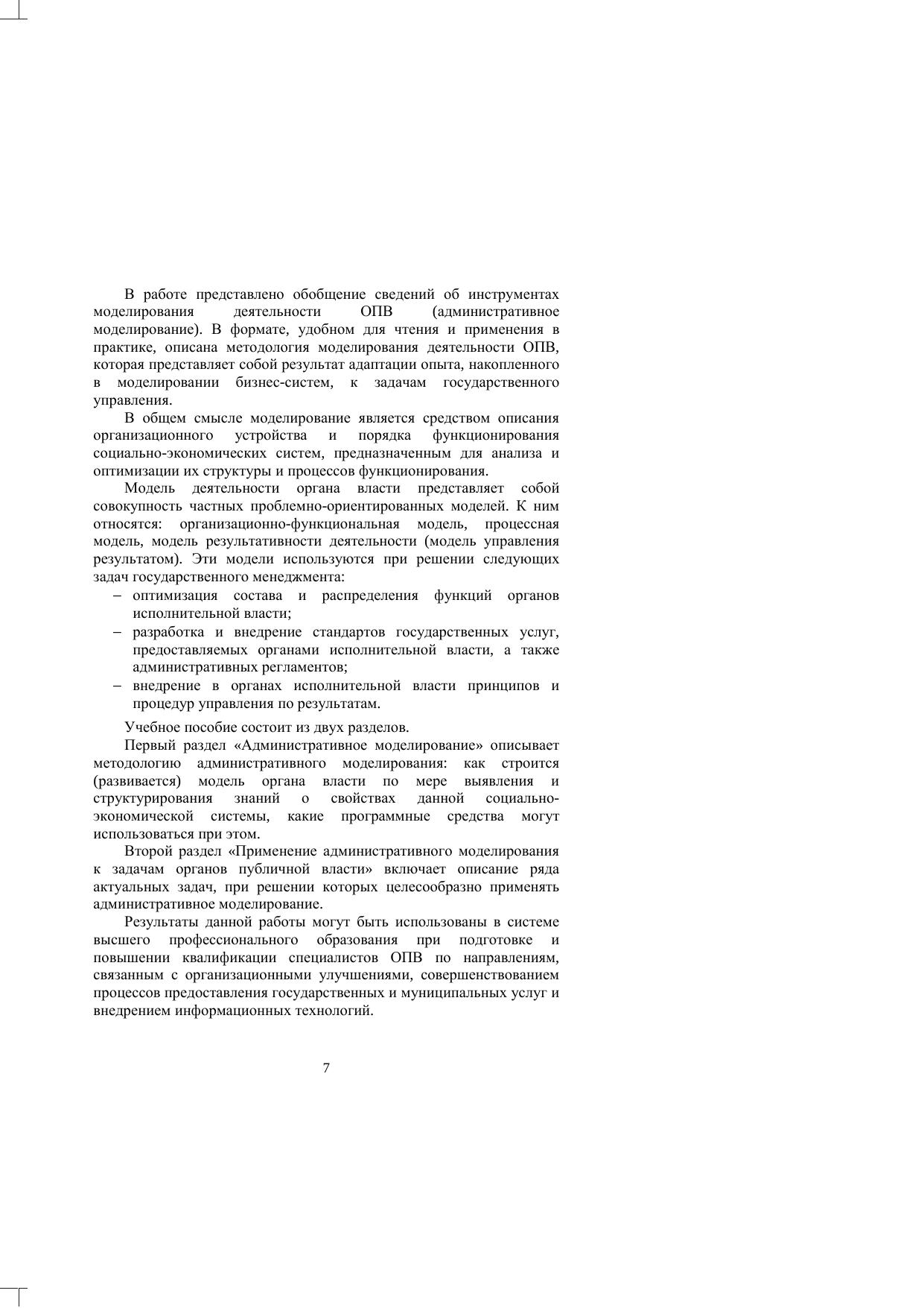 Учебное пособие посвящено изучению методологии, практики и возможностей применения технологий и методов административного моделирования к задачам органов государственной власти и местного самоуправления.Издание адресовано студентам магистерской программы «Управление государственными информационными системами» по направлению 220100 «Системный анализ и управление» ислушателям дополнительной образовательной программы повышения квалификации «Электронное правительство и инновационные технологии управления», реализуемой Центром технологий электронного правительства НИУ ИТМО.