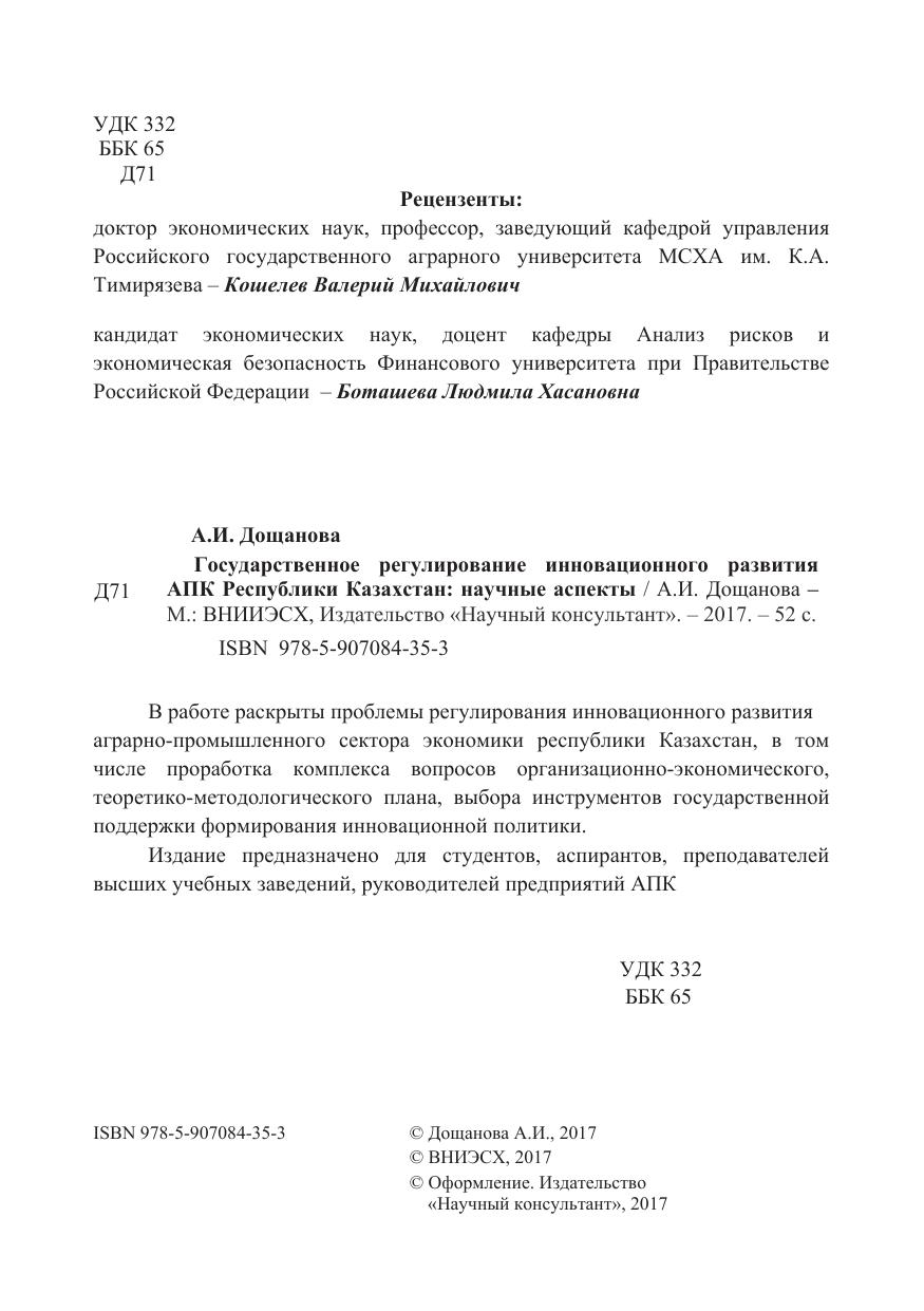 В работе раскрыты проблемы регулирования инновационного развития аграрно-промышленного сектора экономики республики Казахстан, в том числе проработка комплекса вопросов организационно-экономического, теоретико-методического плана, выбора инструментов государственной поддержки формирования инновационной политики.