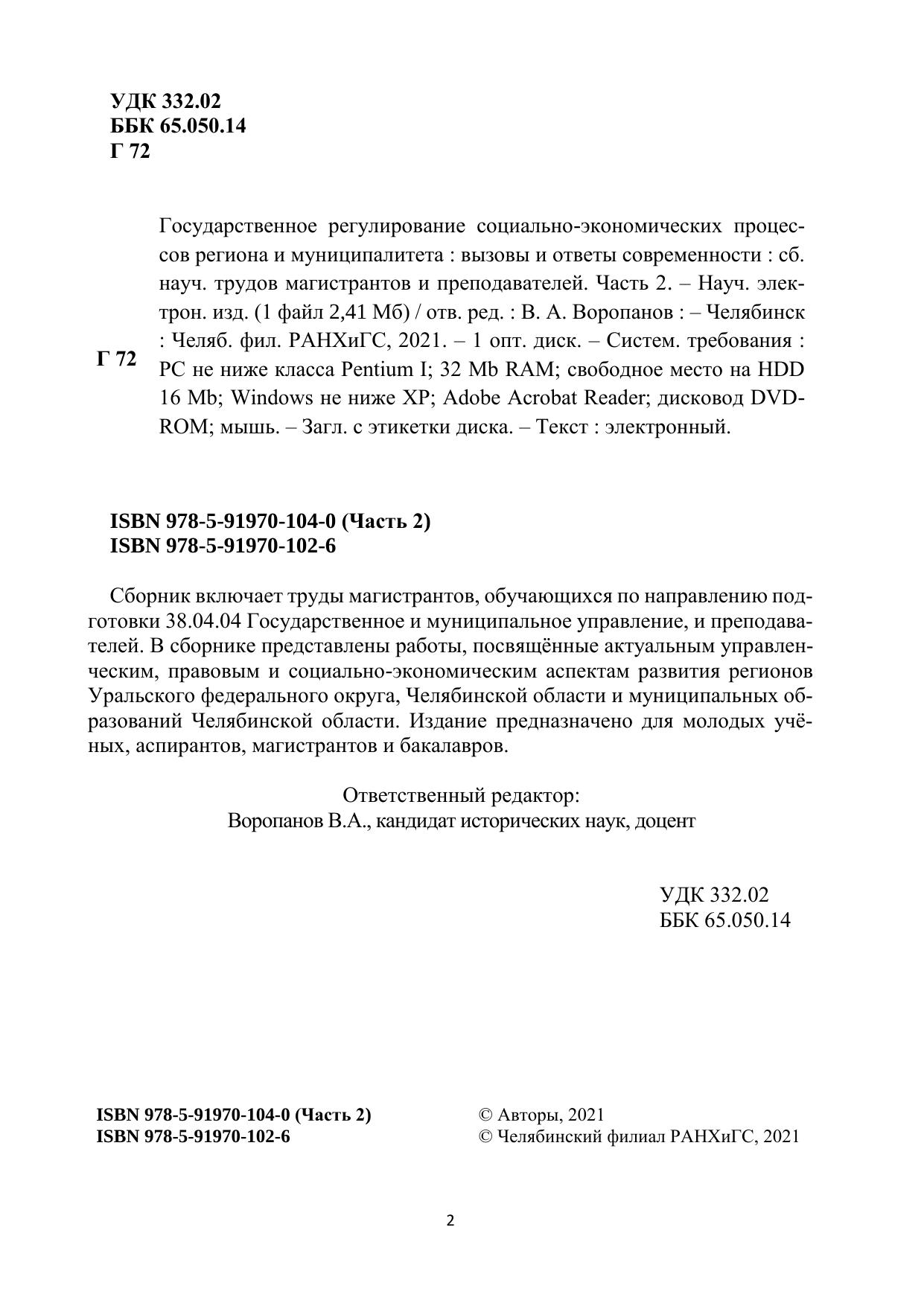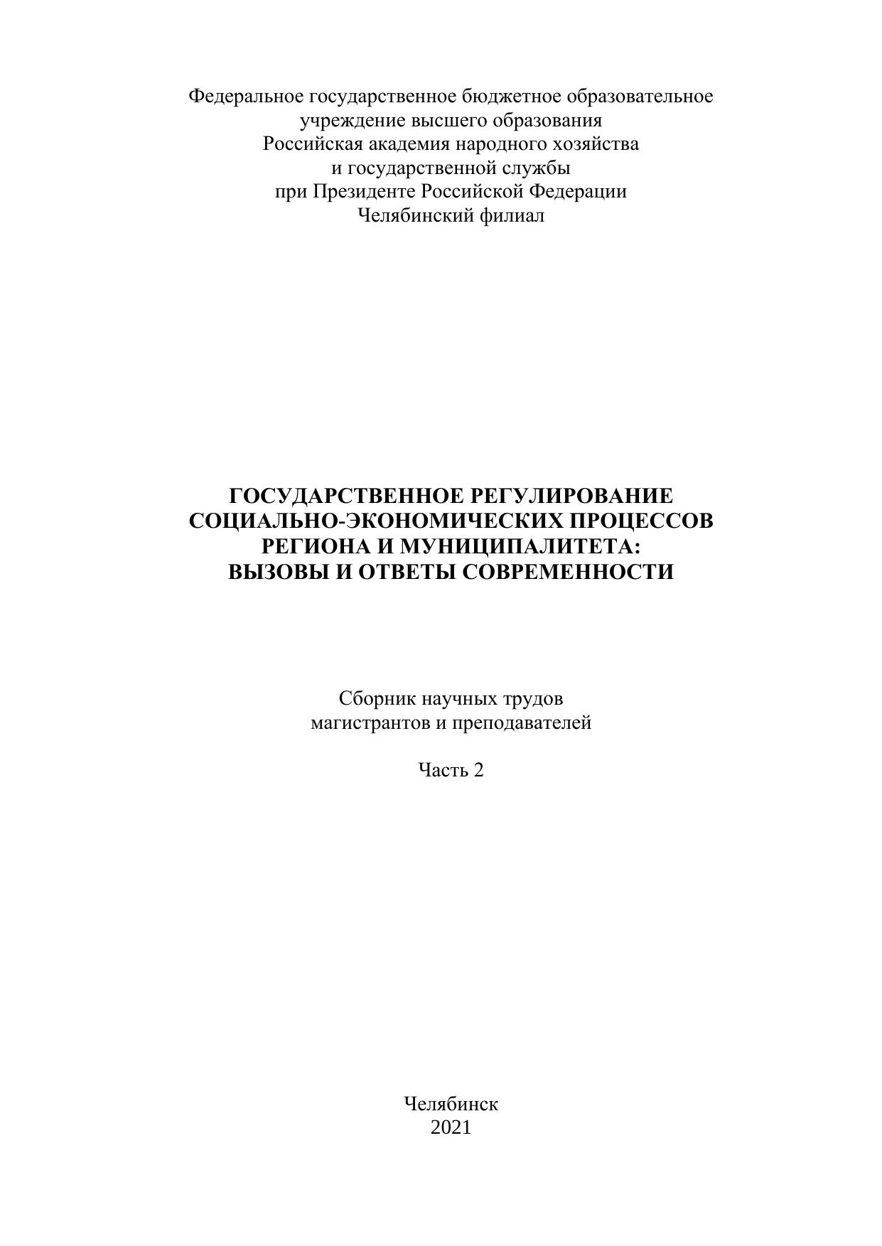 Государственное регулирование социально-экономических процессов региона и муниципалитета: вызовы и ответы современности: сборник научных трудов магистрантов и преподавателей. Часть 2