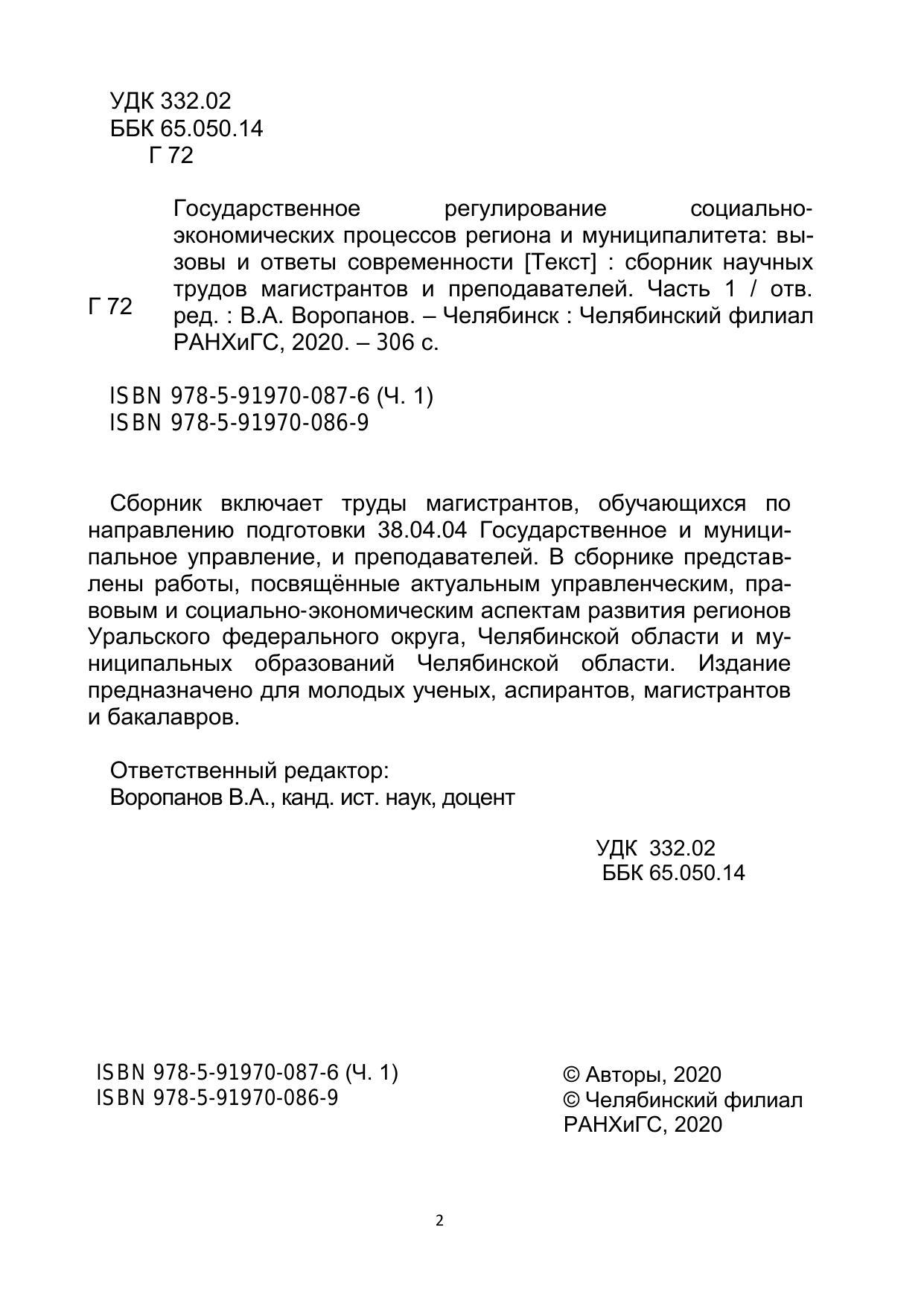 Государственное регулирование социально-экономических процессов региона и муниципалитета: вызовы и ответы современности: сборник научных трудов магистрантов и преподавателей. Часть 1
