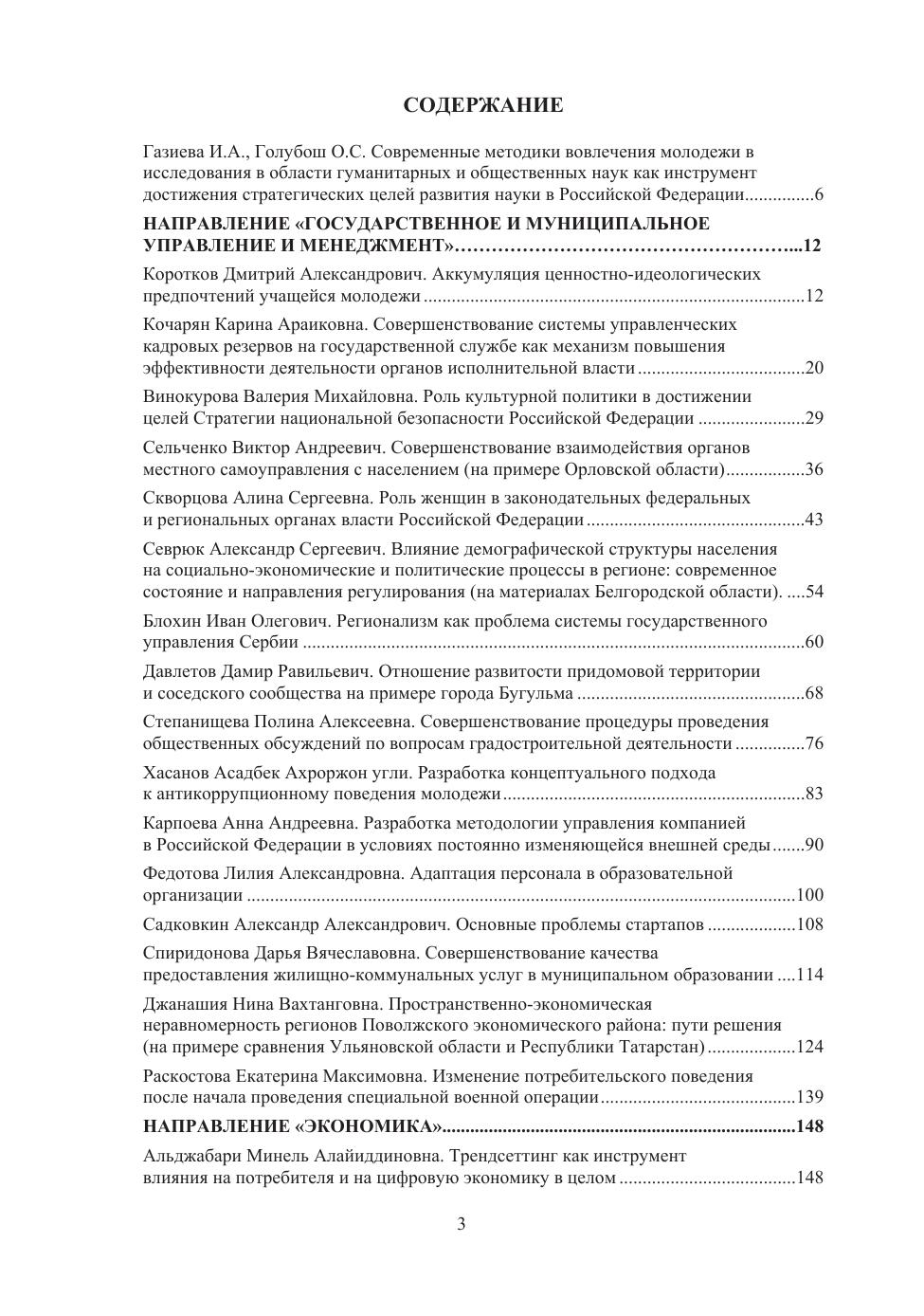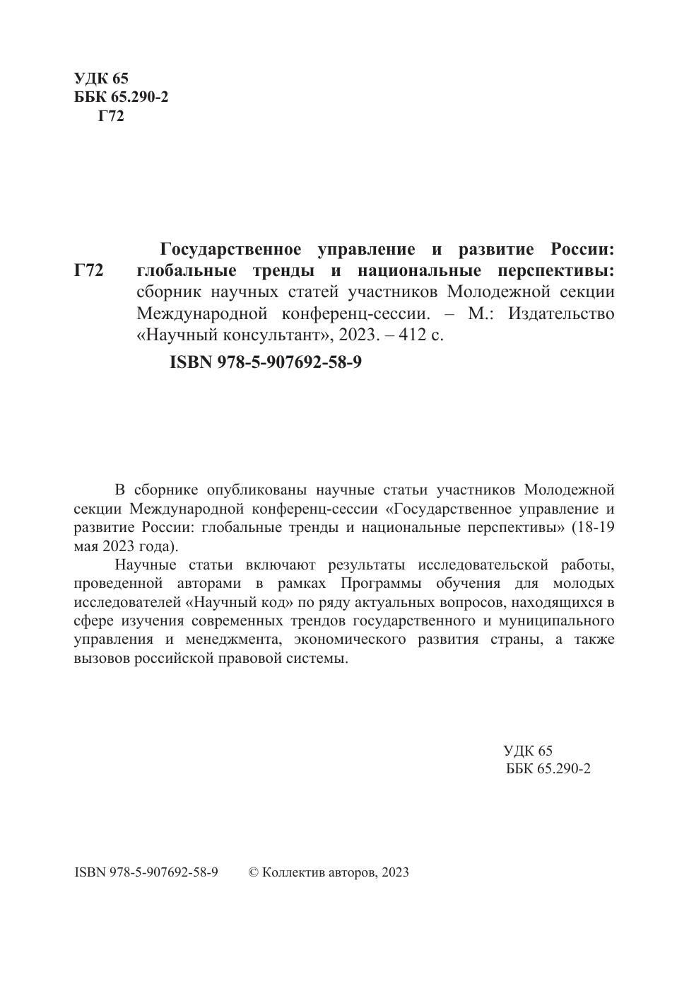 В сборнике опубликованы научные статьи участников Молодежной секции Международной конференц-сессии «Государственное управление и развитие России: глобальные тренды и национальные перспективы» (18-19 мая 2023 года).