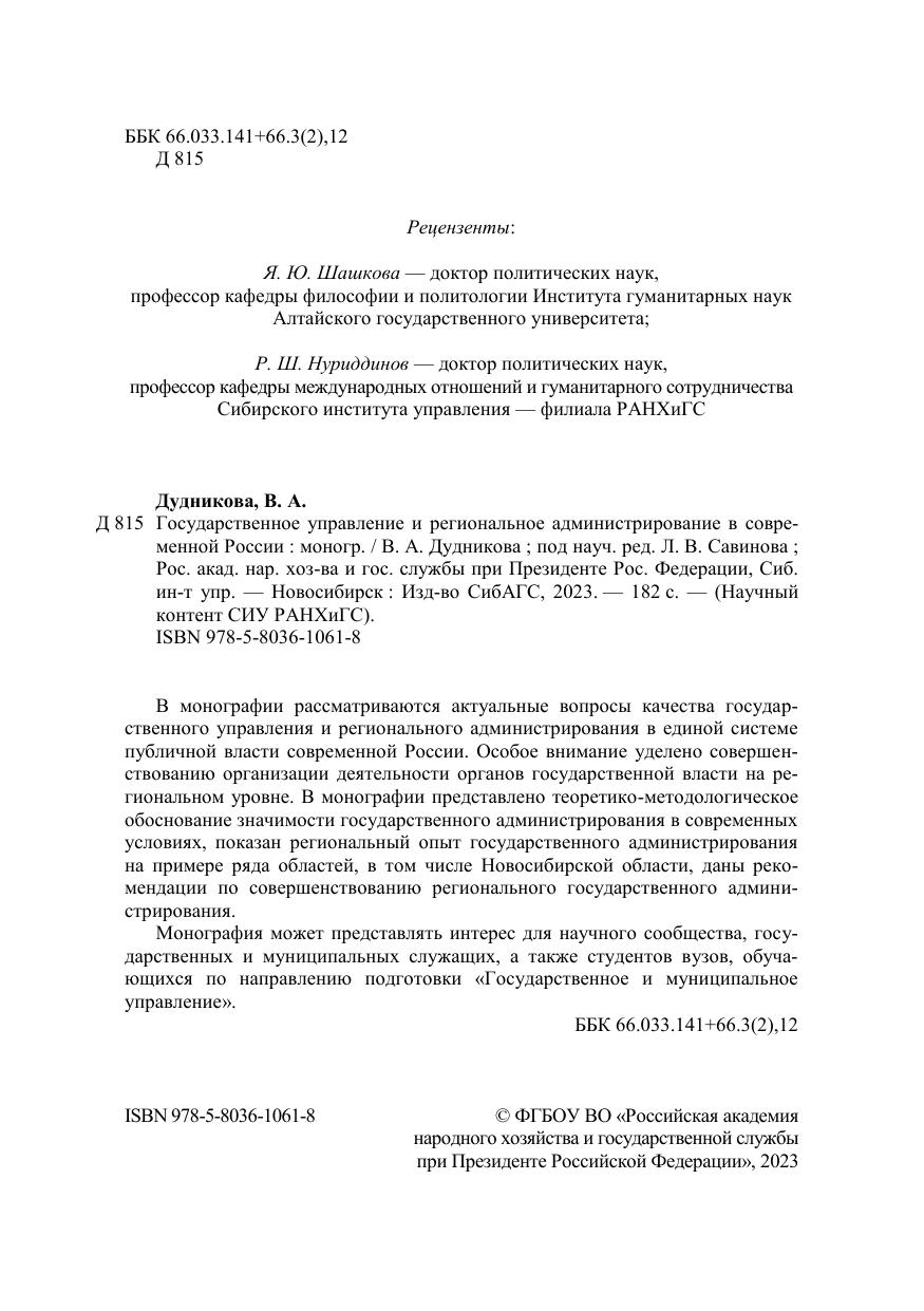 В монографии рассматриваются актуальные вопросы качества государ-ственного управления и регионального администрирования в единой системе публичной власти современной России. Особое внимание уделено совершен-ствованию организации деятельности органов государственной власти на ре-гиональном уровне. В монографии представлено теоретико-методологическое обоснование значимости государственного администрирования в современных условиях, показан региональный опыт государственного администрирования на примере ряда областей, в том числе Новосибирской области, даны реко-мендации по совершенствованию регионального государственного админи-стрирования. Монография может представлять интерес для научного сообщества, госу-дарственных и муниципальных служащих, а также студентов вузов, обуча-ющихся по направлению подготовки «Государственное и муниципальное управление».