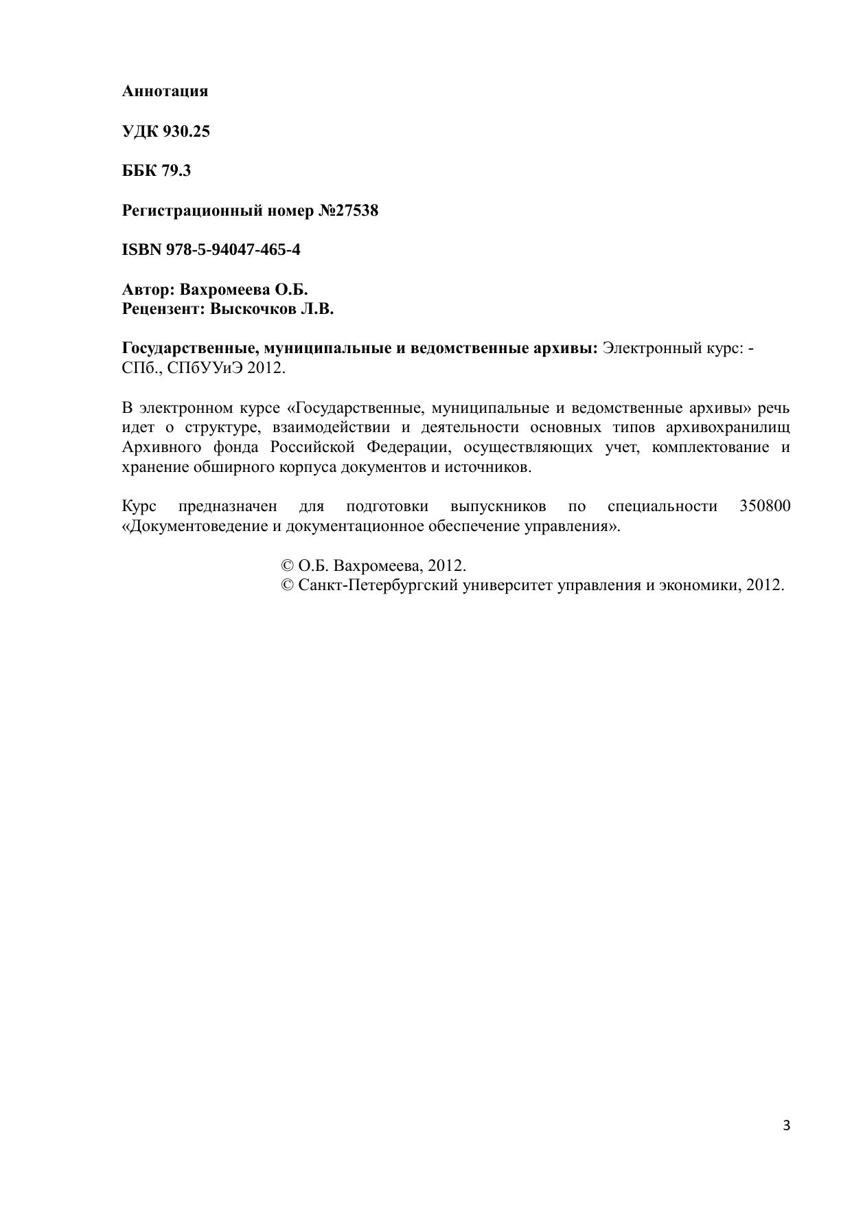 В электронном курсе «Государственные, муниципальные и ведомственные архивы» речь идет о структуре, взаимодействии и деятельности основных типов архивохранилищ Архивного фонда Российской Федерации, осуществляющих учет, комплектование и хранение обширного корпуса документов и источников. Курс предназначен для подготовки выпускников по специальности 350800 «Документоведение и документационное обеспечение управления».